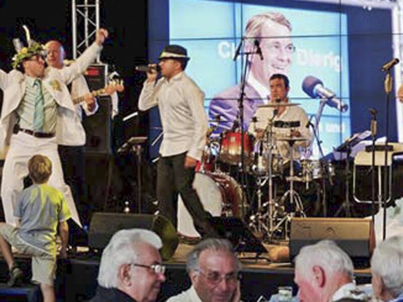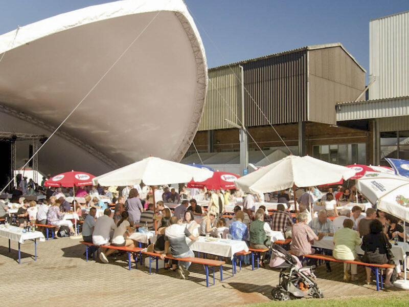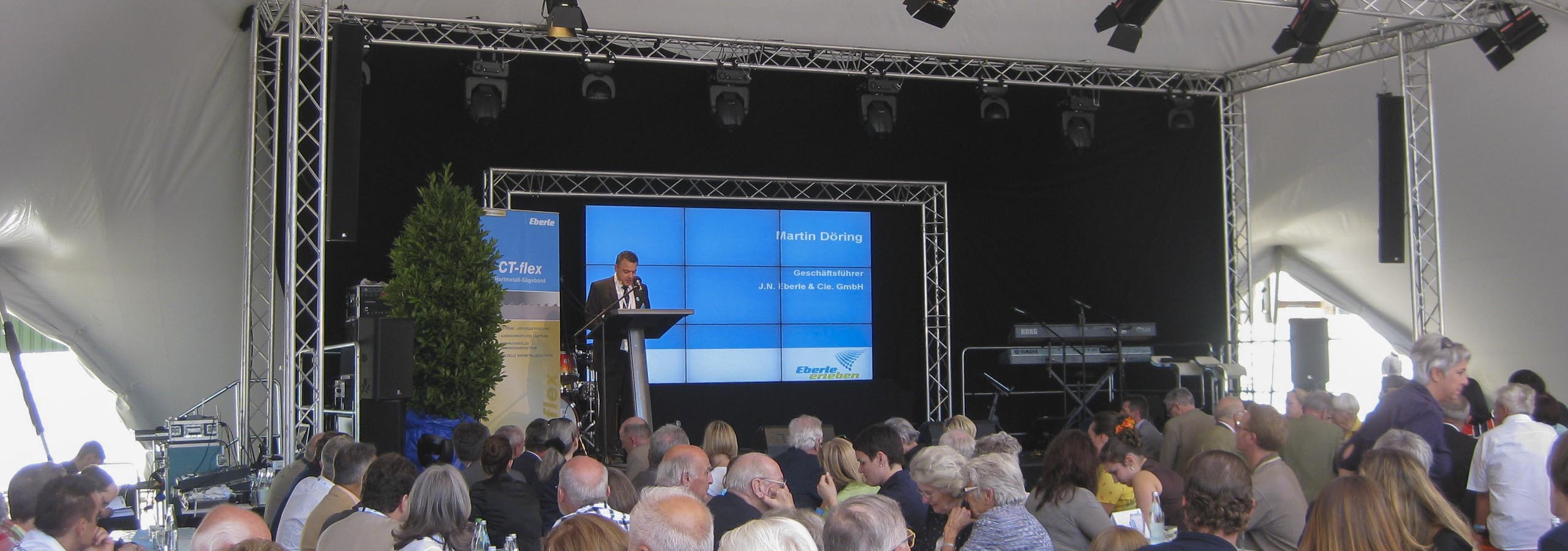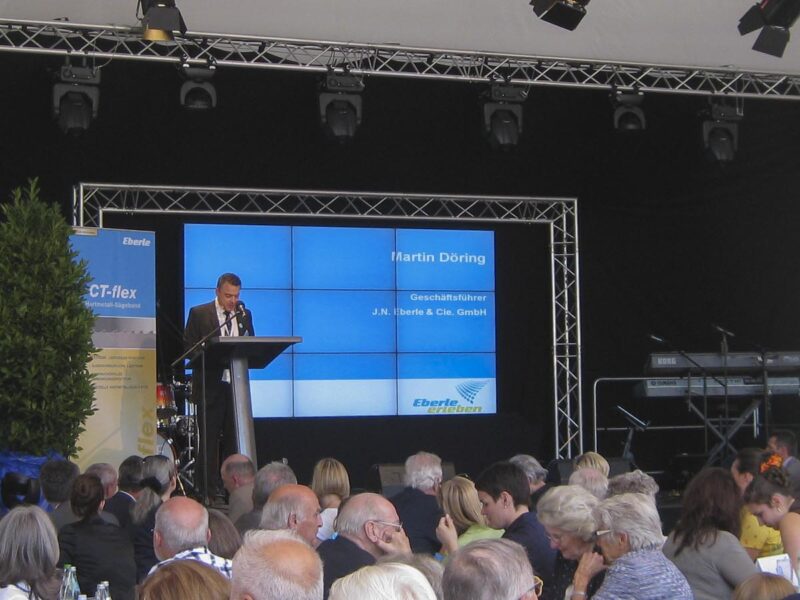 For the nearly 1000 guests, employees and their families, the event began right at the entrance. Here they had to undergo a rather unusual inspection. For example, they were only allowed onto the event grounds with an appropriately wide smile. Continuing through the alleys between the brick buildings of the company, they entered the “Saw Hall,” where a journey through the company’s history began. In addition to some historical machines, there were also 3 multimedia projections with images from different eras of Eberle’s history. This journey was accompanied by a soundscape created by Audio/Video Productions Mang, featuring some familiar sounds from the production halls. Then it was on to the actual event grounds. The central focal point of the event was our Opera tent with built-in stage. In brilliant sunshine, it provided sun protection over 380 square meters through its opaque roof membrane. In addition to speeches by Martin Döring, Managing Director of Eberle; Dr. Kurt Gribl, Mayor of Augsburg; and Deputy Prime Minister Martin Zeil, the premiere presentation of the new Eberle corporate film formed the highlight of the official event program.