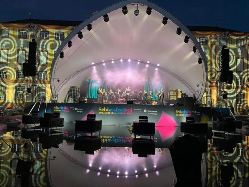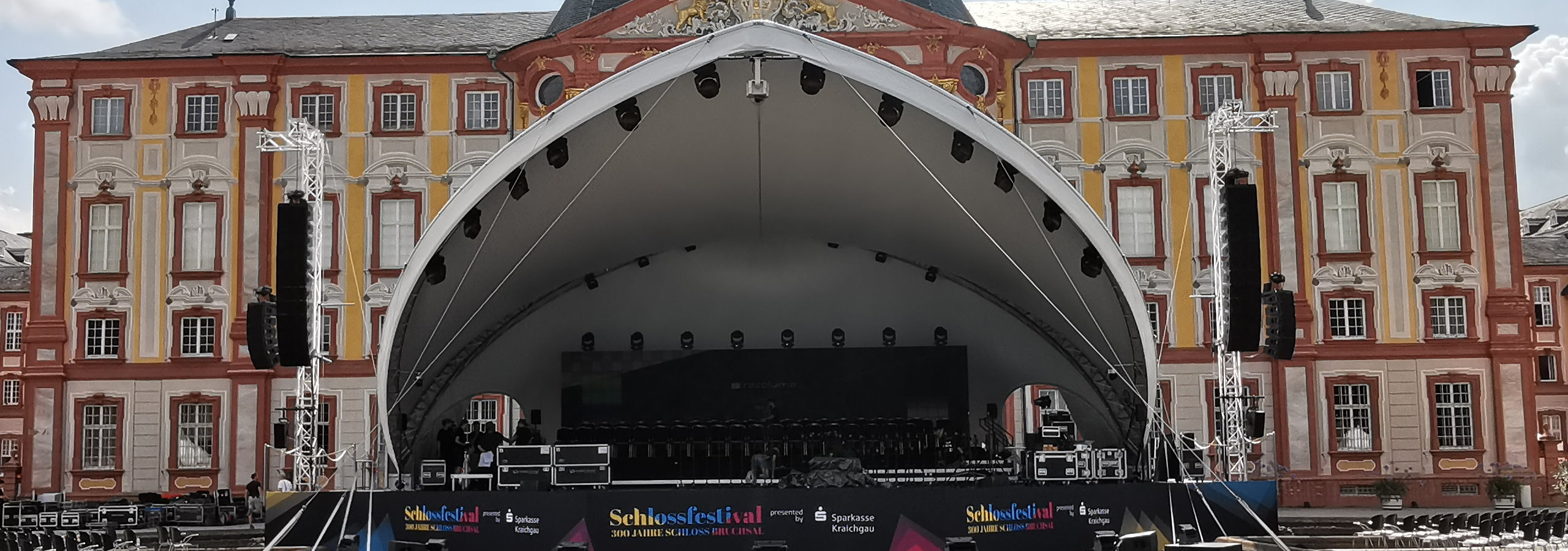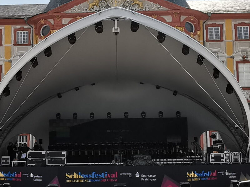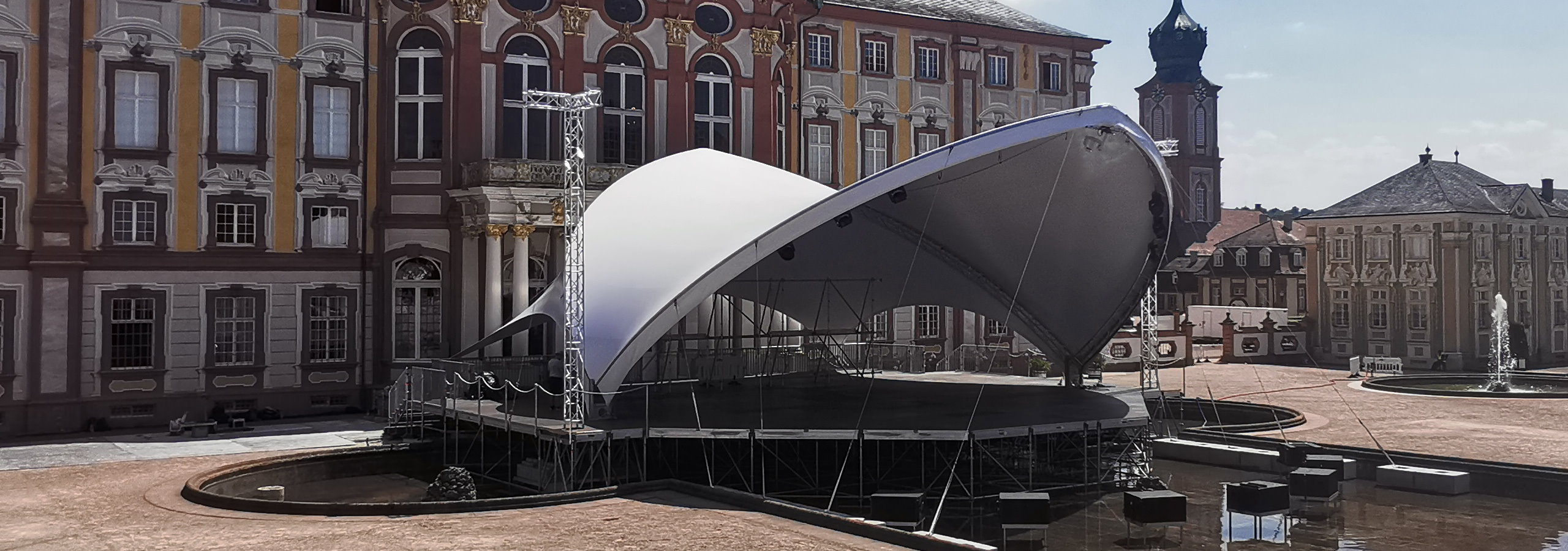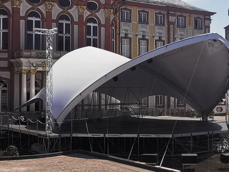Since the stage had to be partially built into a monument-protected fountain system, the stage substructure was adapted to the ground conditions. A particular challenge was the weight distribution of the stage loads in the sandstone fountain. To avoid damaging the fountain, certain loads could not be exceeded. Through the use of a specially developed support structure, this was prevented and the stage could be realized. Thus, the stage itself became a technical and visual highlight.