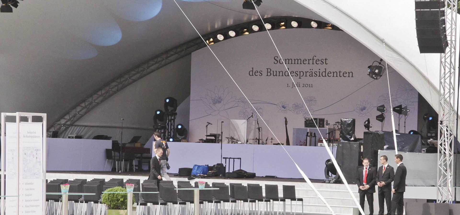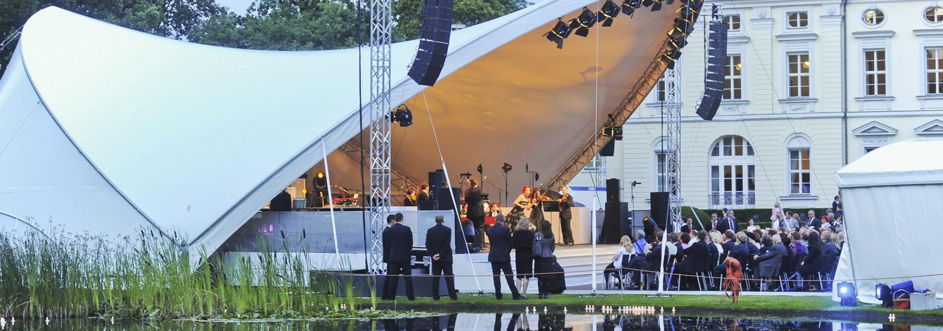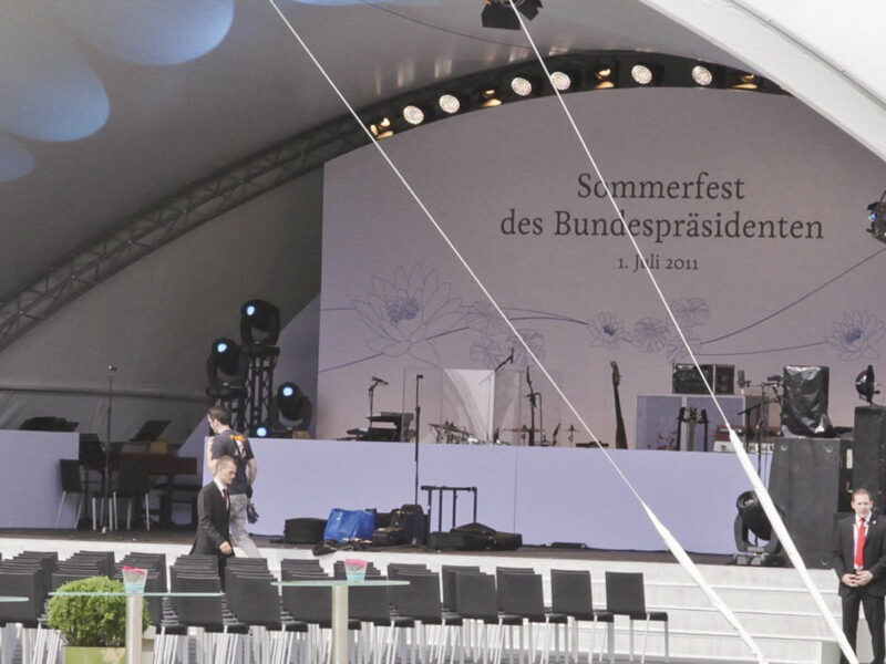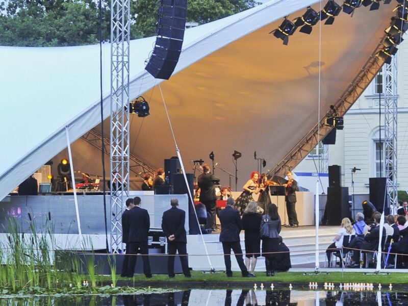 Already last year, the executing agency CB.e Clausecker | Bingel. Ereignisse AG as well as the Federal Presidential Office decided on Opera-Tent.com. For the new event concept implemented for the first time last year, they were looking for an elegant, not too bulky stage roof covering with however 260sqm of stage area. They found this balance between design and large stage area in our roofing system. Enthusiastic about the system and the swift assembly and dismantling, the choice for this year’s summer festival fell on Opera-Tent again, also due to the commitment.
