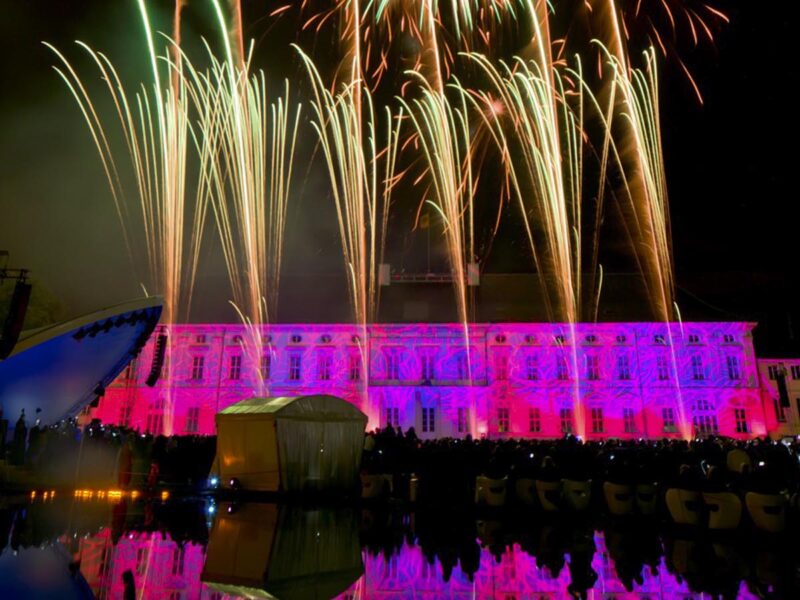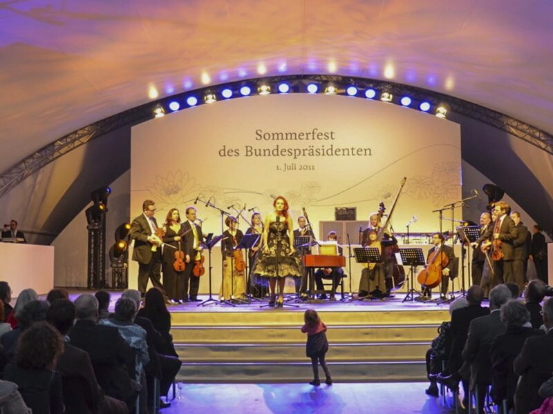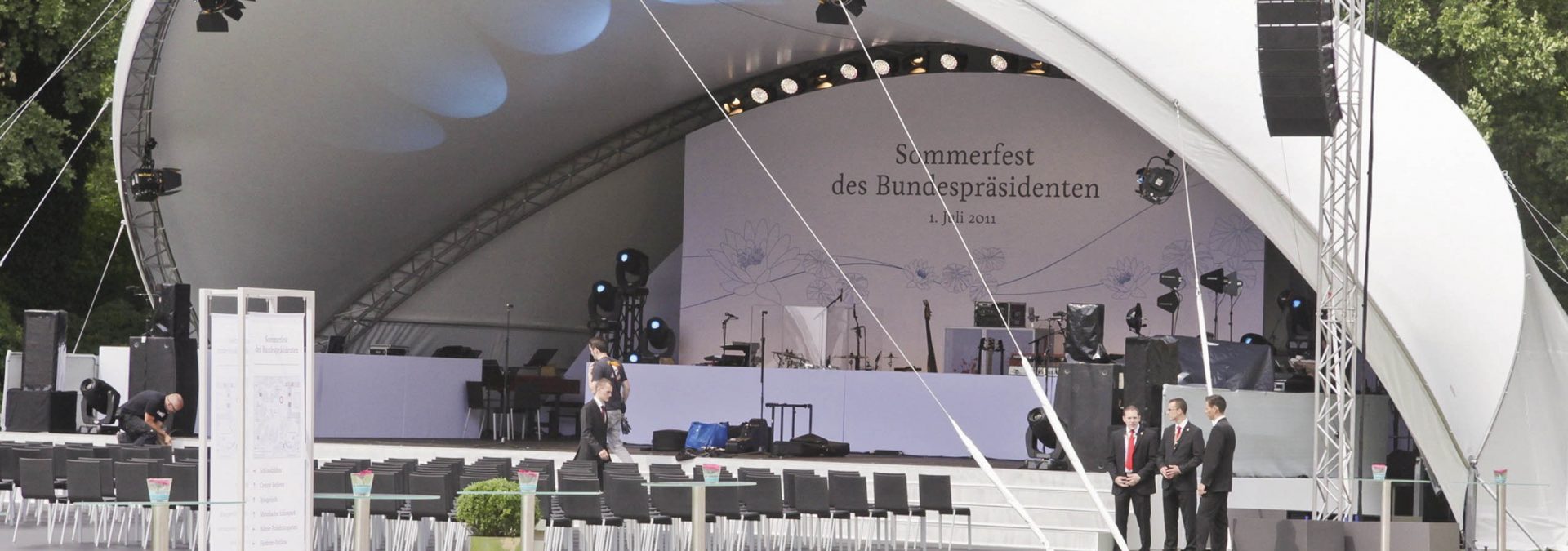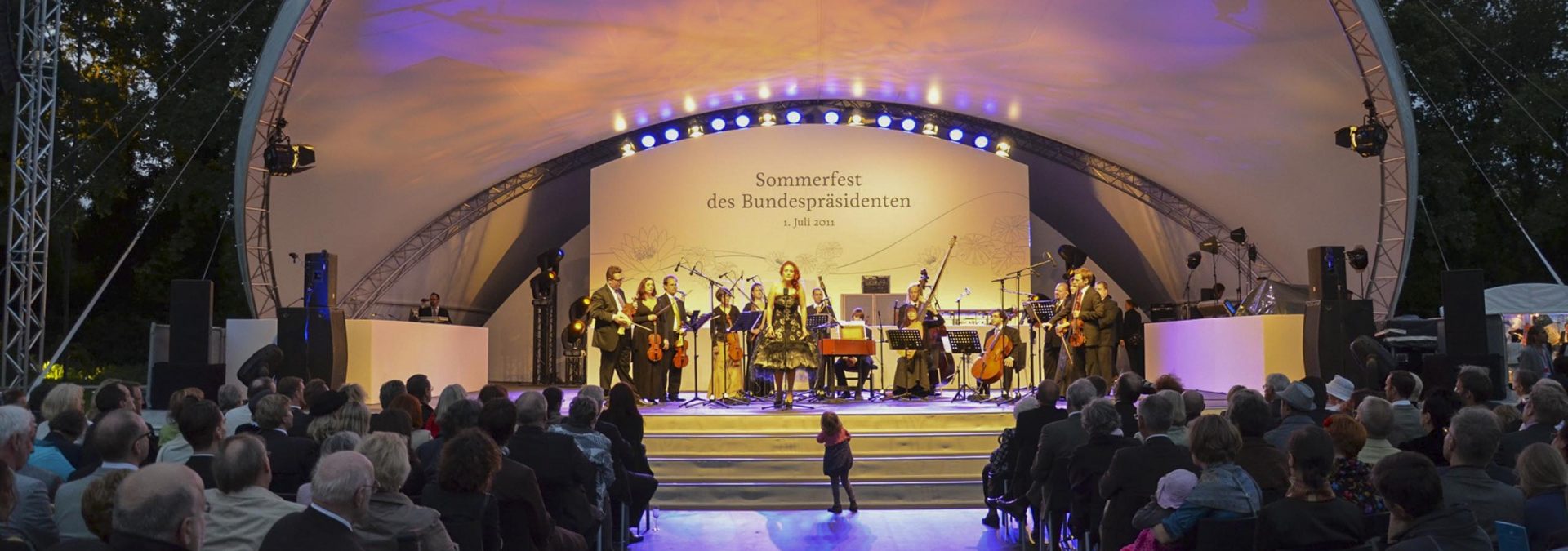 Already last year, the executing agency CB.e Clausecker | Bingel. Ereignisse AG as well as the Federal Presidential Office decided on Opera-Tent.com. For the new event concept implemented for the first time last year, they were looking for an elegant, not too bulky stage roof covering with however 260sqm of stage area. They found this balance between design and large stage area in our roofing system. Enthusiastic about the system and the swift assembly and dismantling, the choice for this year’s summer festival fell on Opera-Tent again, also due to the commitment.