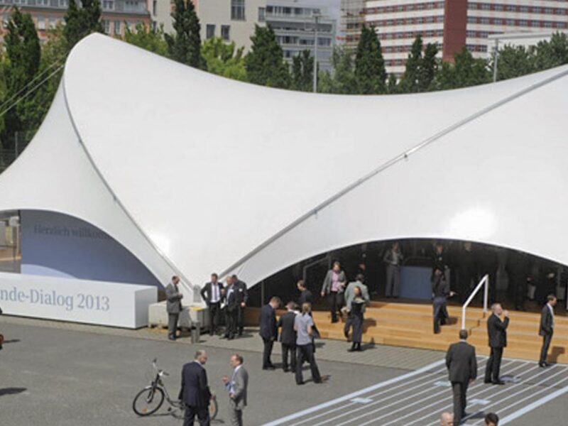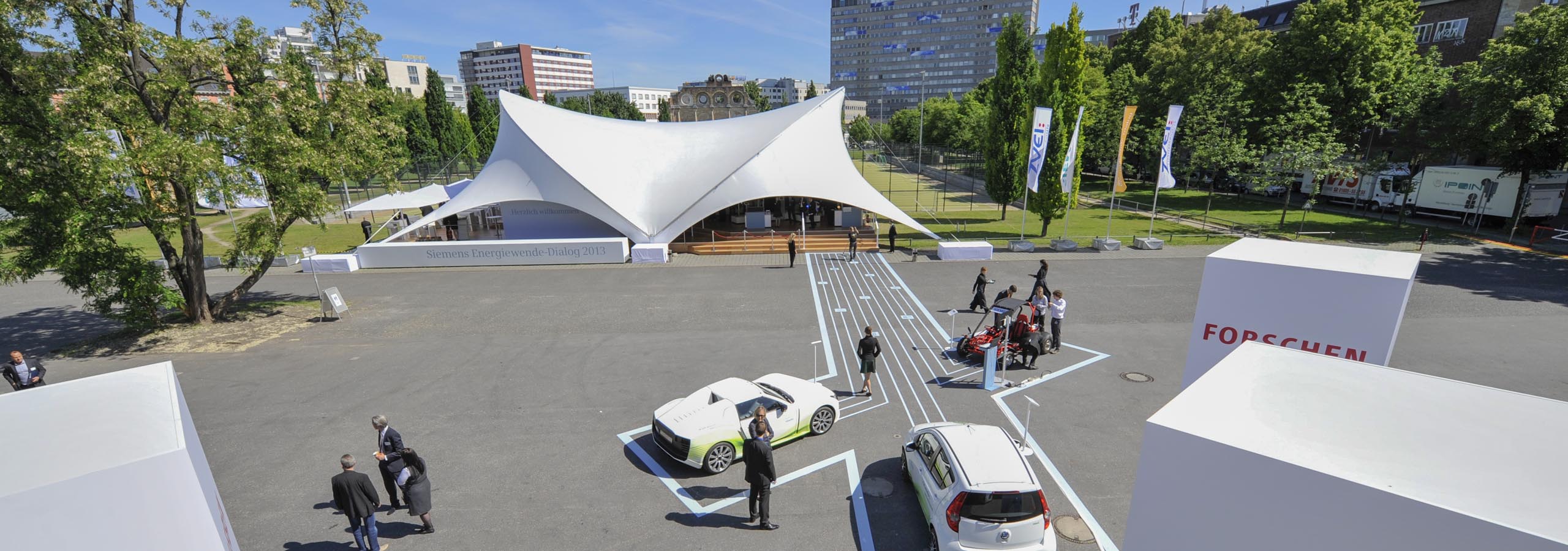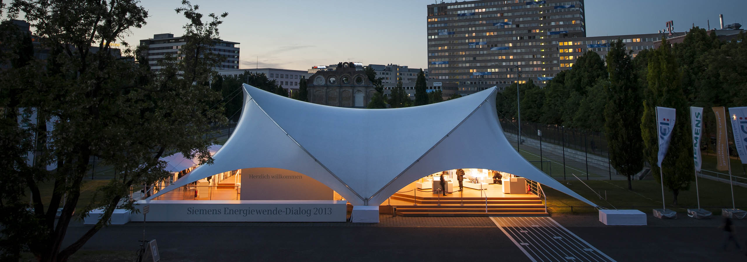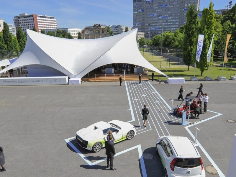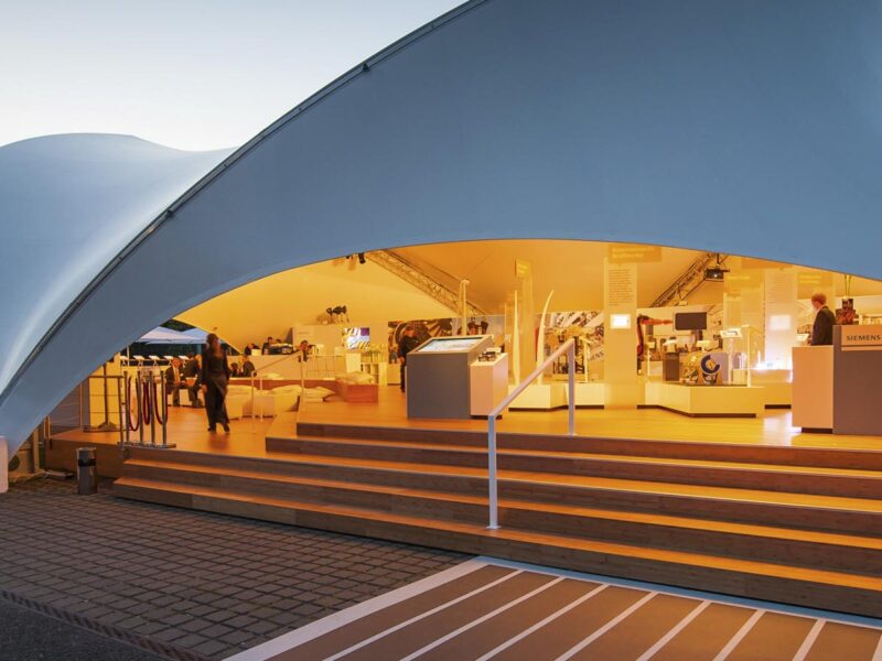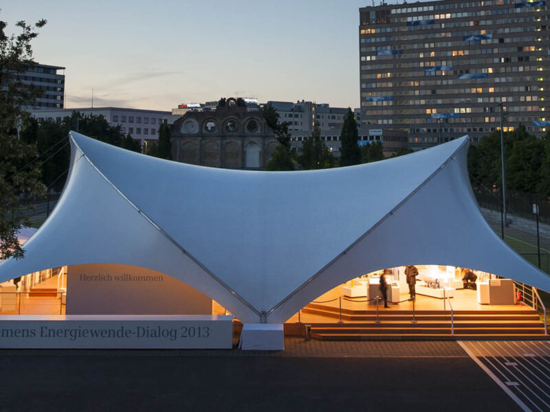 Siemens also broke new ground in the choice of its event structures, and so we erected an Opera-Tent 18×21 on the forecourt of the Tempodrom in Berlin. It served as an extraordinary exhibition tent in which many exhibits vividly illustrated the fields of action of the energy transition and their solutions, and experts were available to answer questions.