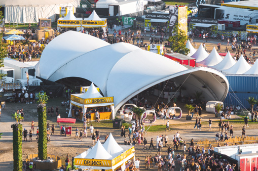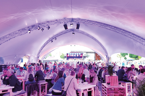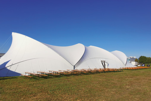Two main roofs, connected by a Duo intermediate tarpaulin, create more space for even more possibilities. As with the Single version, end panels can be installed on both sides. The arches of the end panels, as well as the Duo intermediate tarpaulin, can be individually designed – open, closed with a white closing panel, or with a window. Each closing tarp features a zip door; in some areas, double-leaf glass-aluminium doors can be installed. By adding further Duo intermediate tarpaulins, it is possible to create an ultimately unlimited Duo Line.