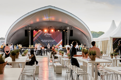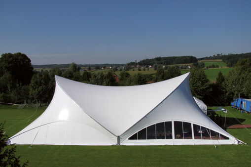The Single variant is the basis of the Opera-Tent tent and stage system – a single main roof with a distinctive silhouette and an open sense of space. Depending on the application, the tent can be designed open, partially enclosed, or fully enclosed. End walls can be installed on any side. The arches of the installed end walls can be customised individually – open, closed with a white closing tarp, or with windows. Each closing tarp features a zip door; in some areas, double-leaf glass-aluminium doors can be installed. Even the Single variant offers an immense range of applications that outshines any other system.