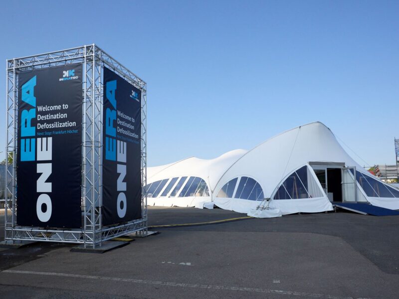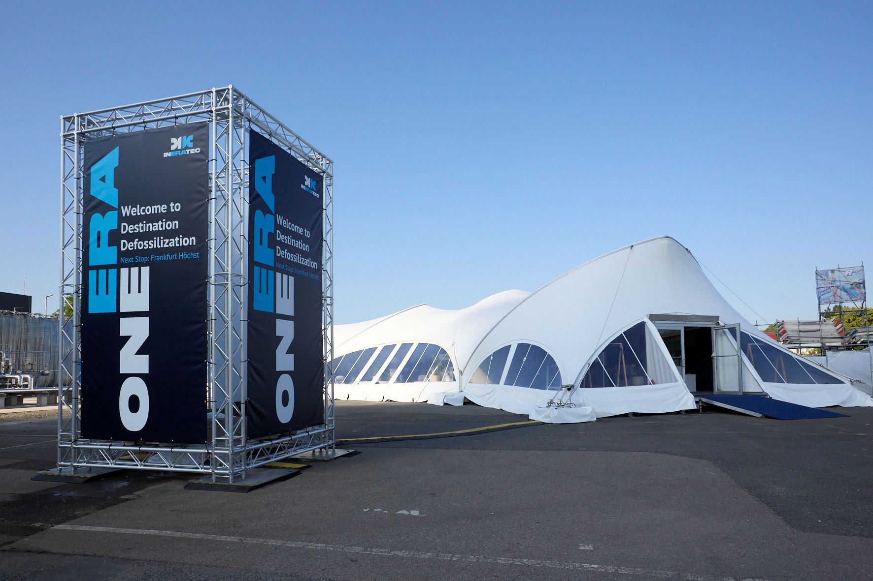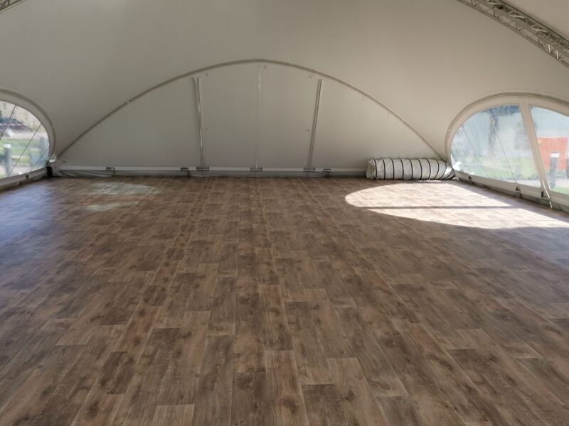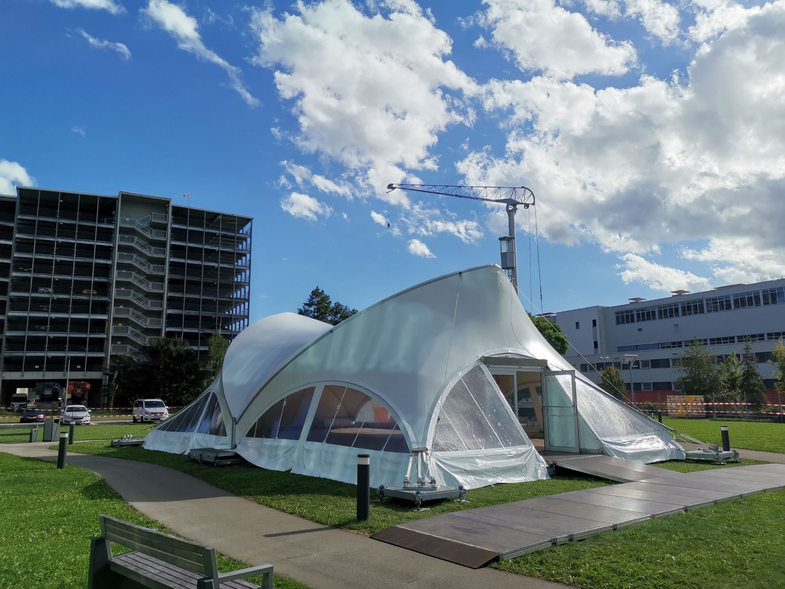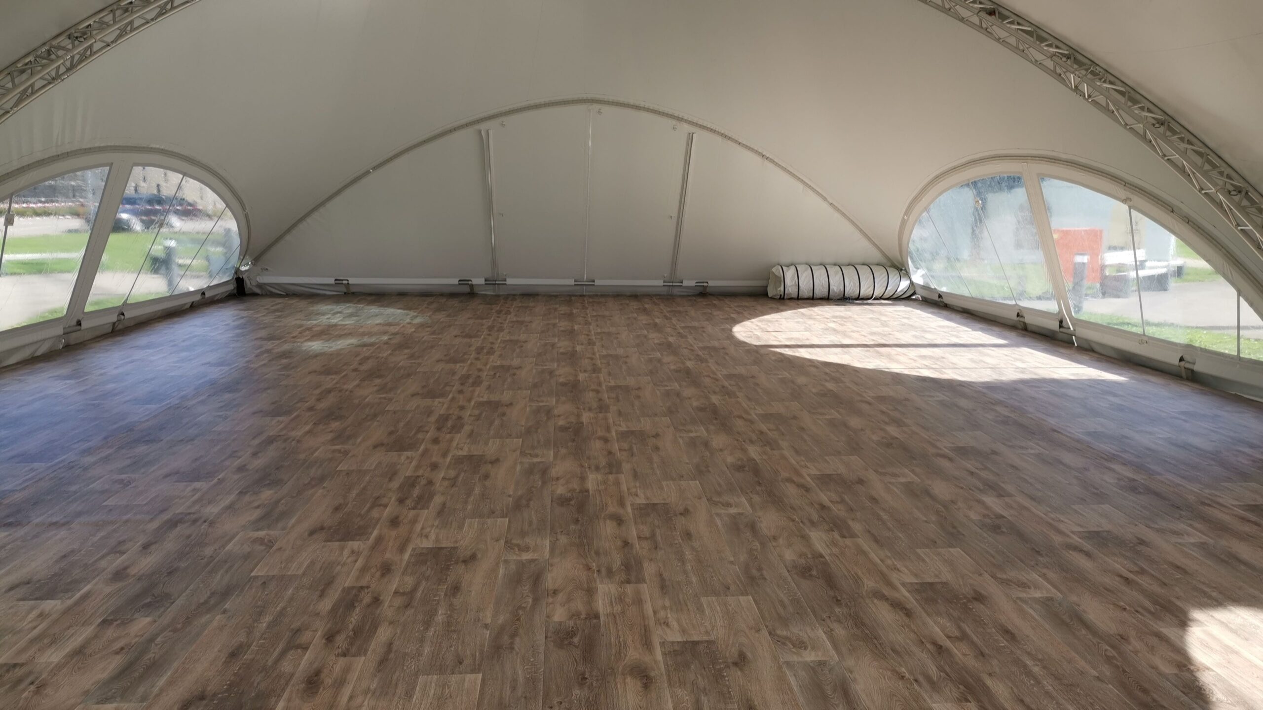Each arch of the OES system can be customised individually: either closed with white closing panels or fitted with stylish window segments that bring transparency and lightness into the tent.