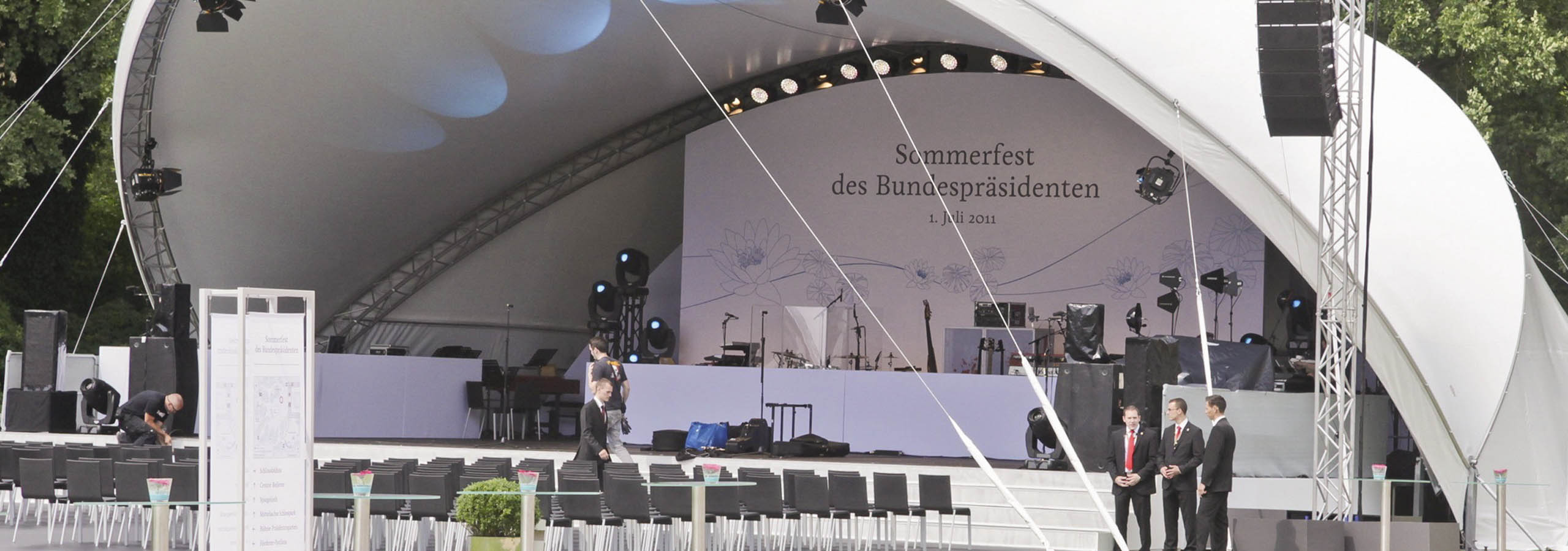 Bereits im letzten Jahr hat sich die ausführende Agentur CB.e Clausecker | Bingel. Ereignisse AG sowie das Bundespräsidialamt für Opera-Tent.com entschieden. Für das letztjährig erstmals durchgeführte, neue Veranstaltungskonzept suchten sie nach einer eleganten, nicht allzu wuchtig wirkenden Bühnenüberdachung mit jedoch 260qm Bühnenfläche. Diesen Spagat zwischen Design und großer Bühnenfläche fanden Sie in unserer Überdachung. Begeistert von dem System und dem zügigen Auf- und Abbau fiel die Wahl für das diesjährige Sommerfest auch aufgrund des Engagements erneut auf Opera-Tent.
