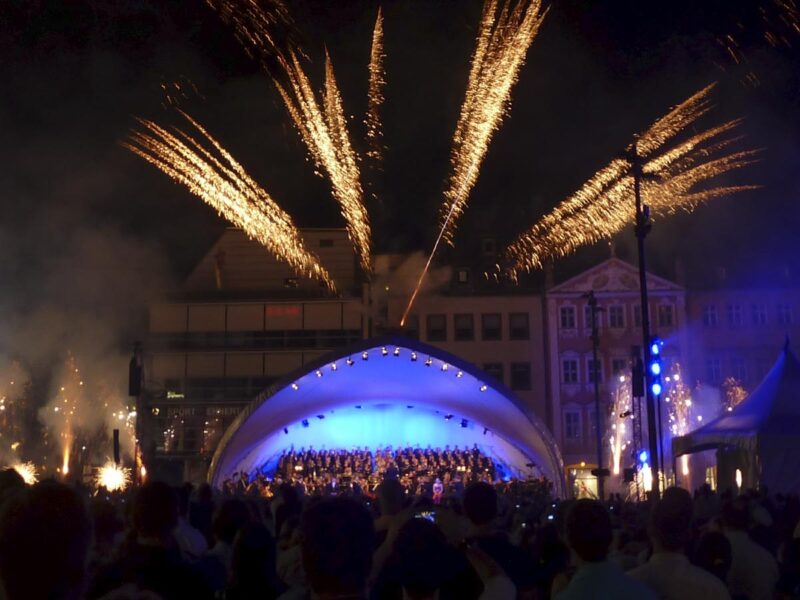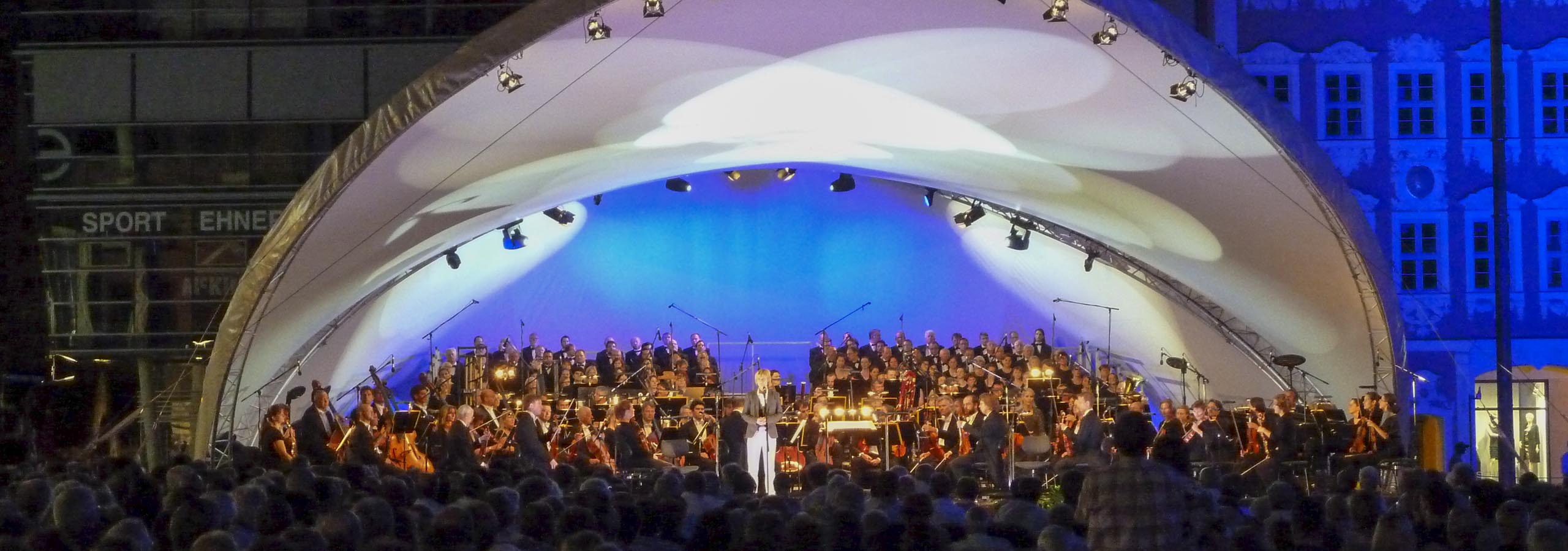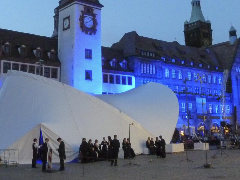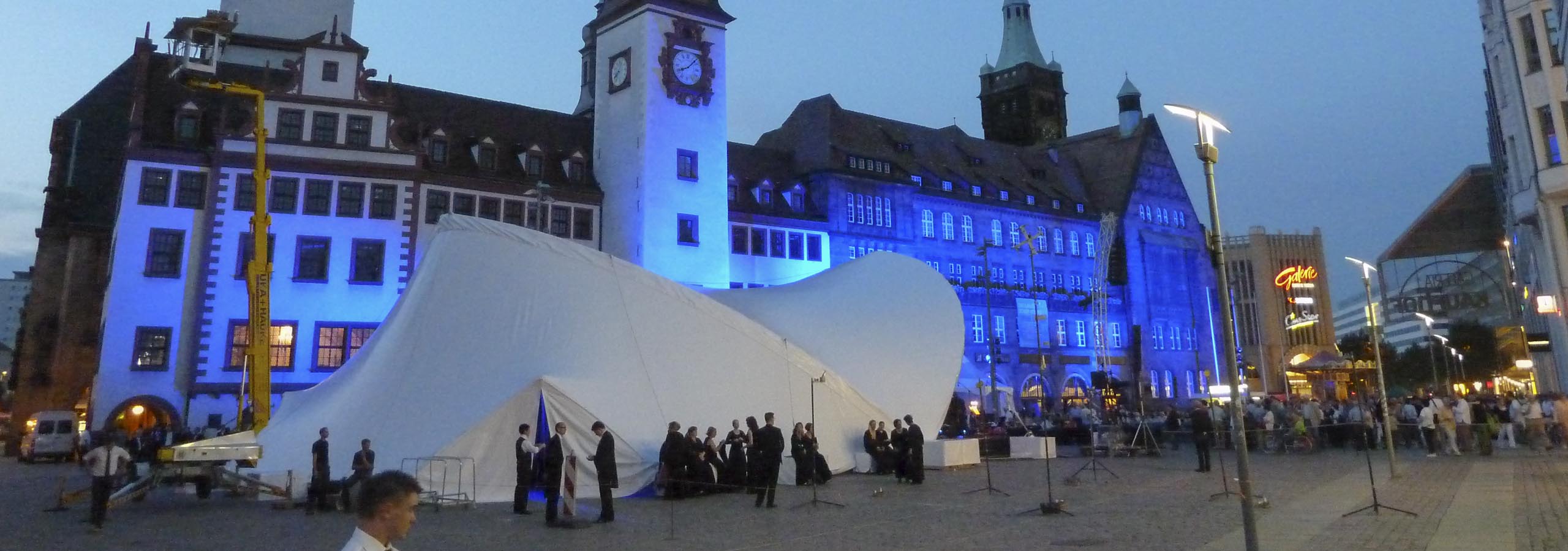 Locuitorii din Chemnitz știu să sărbătorească! Și aceasta pentru a treia oară în acest an alături de noi. Pentru concertul final al săptămânii festive cu ocazia aniversării de 100 de ani a Noului Primărie, Opera-Tent a livrat din nou acoperișul scenei incluzând 288mp de scenă încorporată, precum și întreaga tehnologie pentru evenimente. Acoperișul nostru a oferit protecție Filarmonicii Robert-Schumann cu peste 200 de membri împreună cu corul, care a interpretat cantata scenică „Carmina Burana” de Carl Orff.