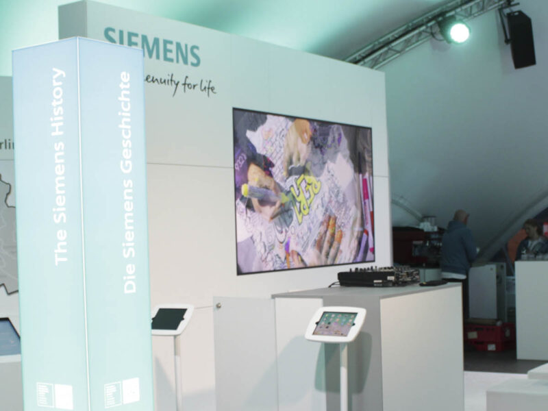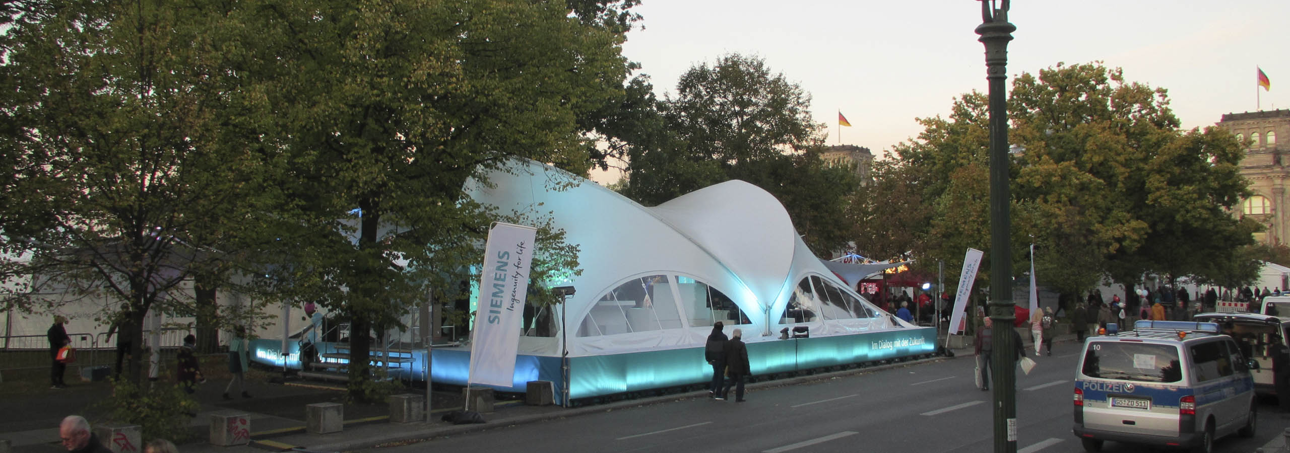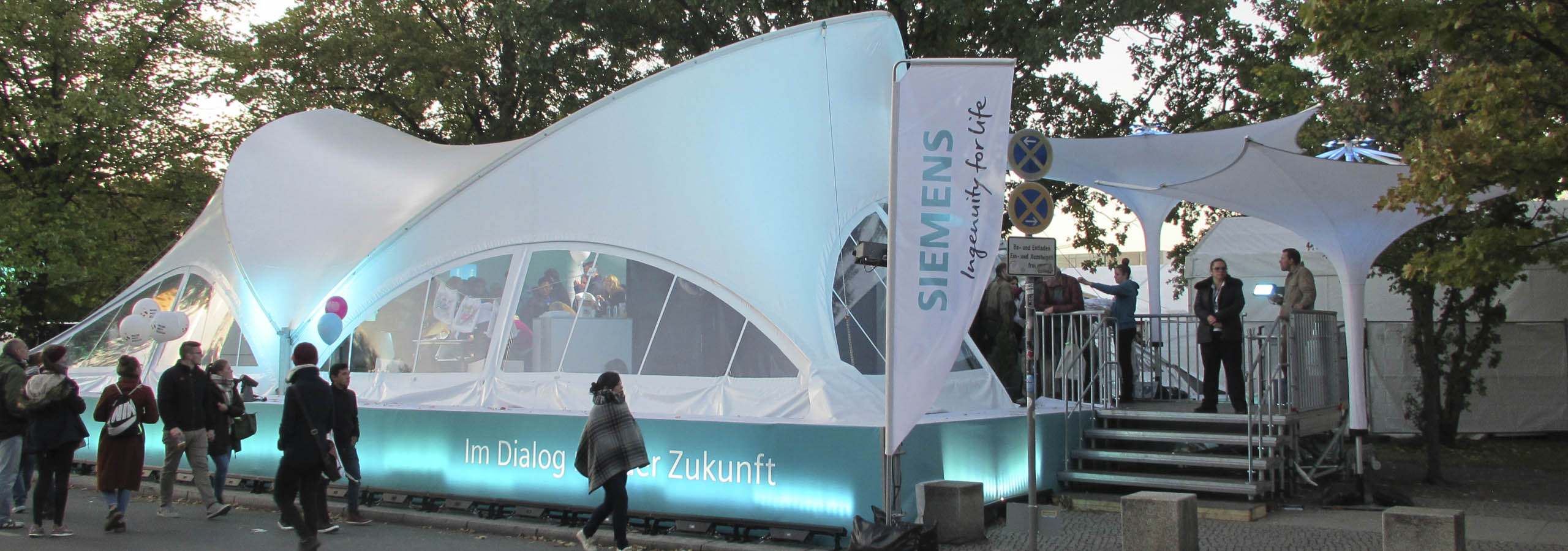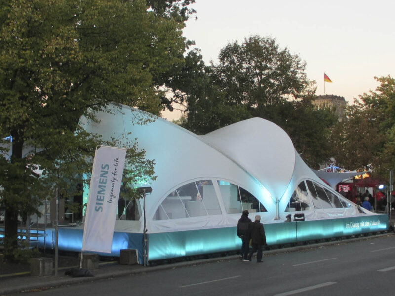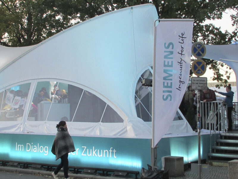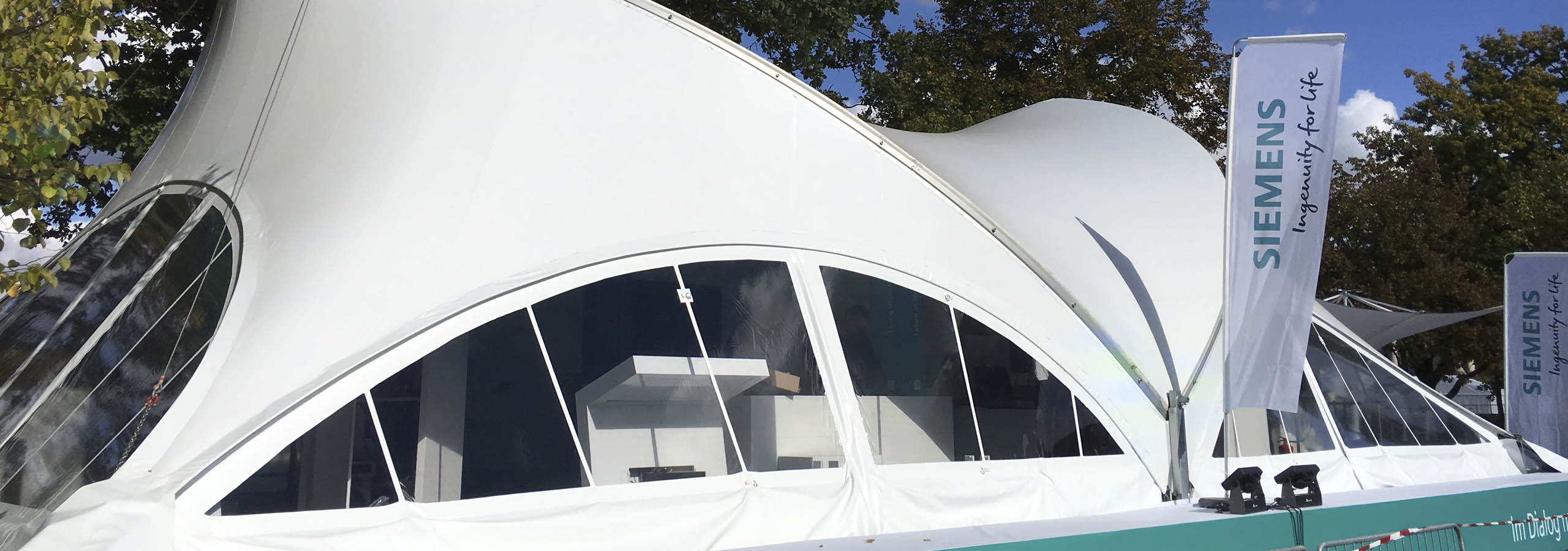 Astfel, pentru clientul nostru Siemens, nu doar că am făcut posibilă construcția în acest loc, ci am obținut și mai multă atenție prin ridicarea cortului, precum și integrarea identității vizuale a companiei.