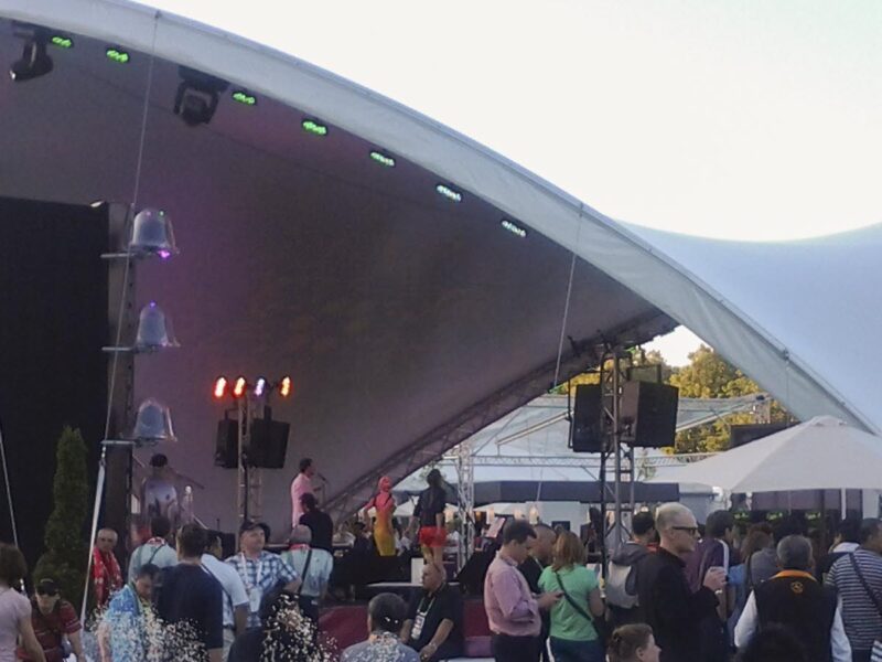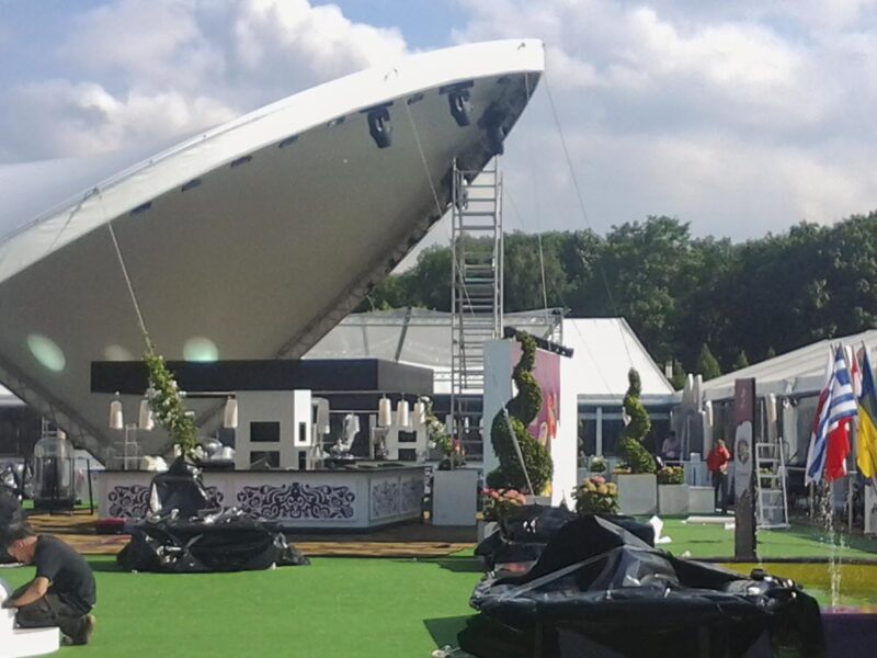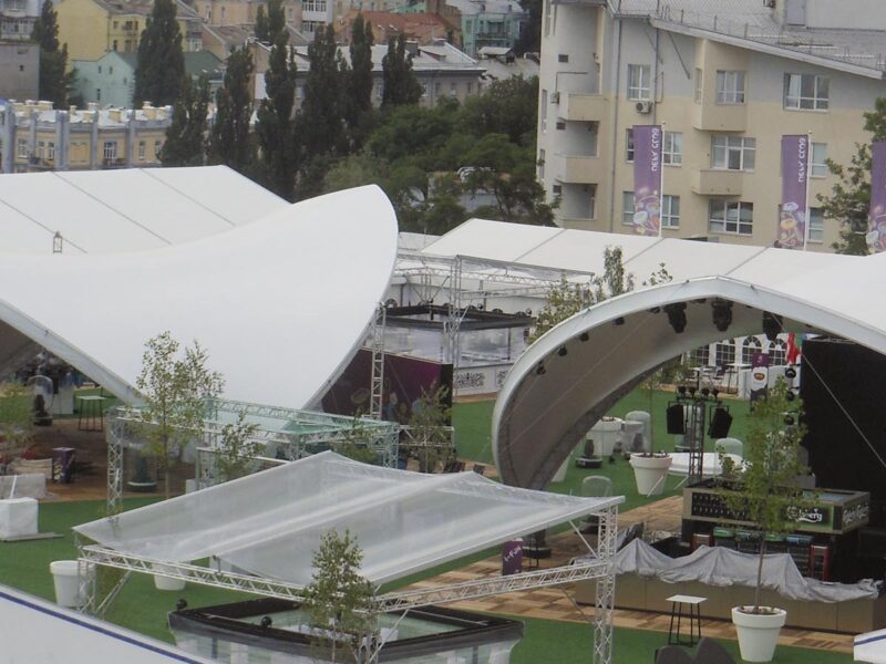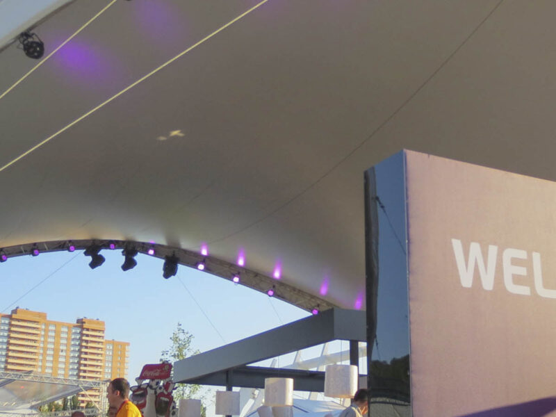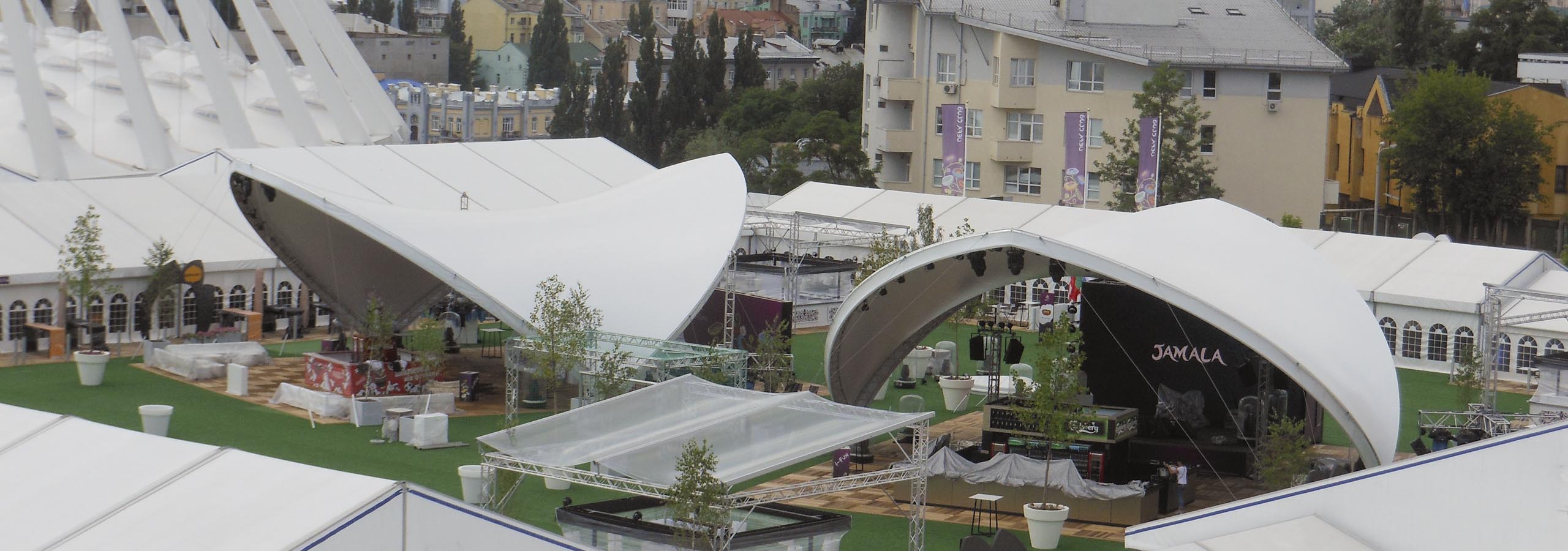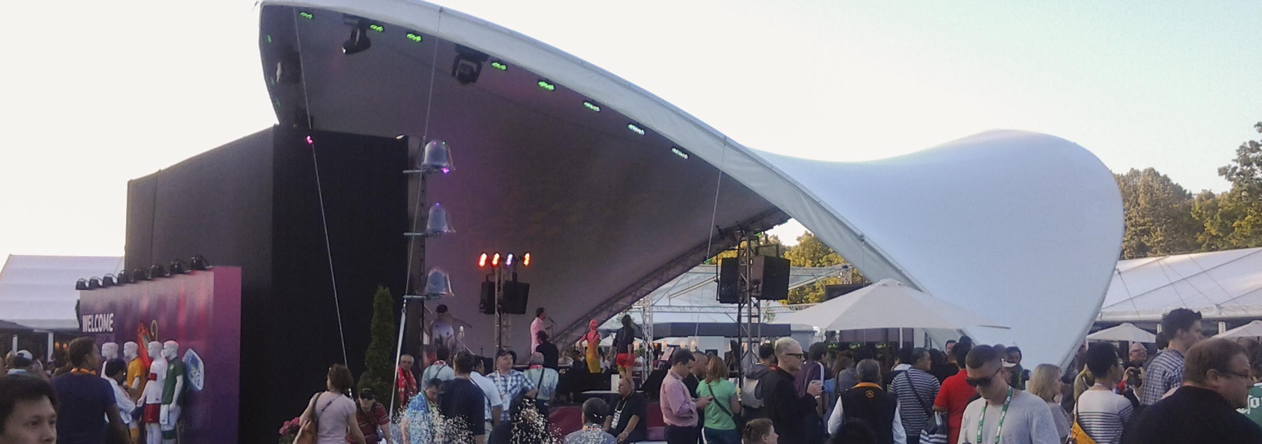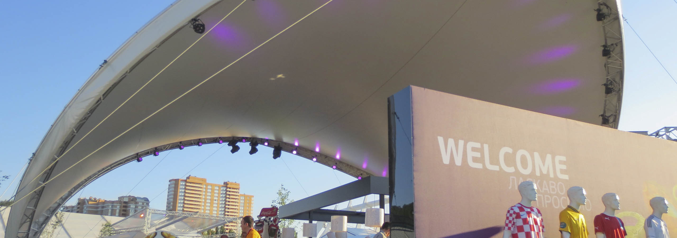 Pentru Campionatul European de fotbal din acest an din Polonia și Ucraina am livrat în total șase dintre corturile noastre Opera. Le-am instalat în centrele pentru vizitatori din Varșovia și Kiev. Au servit ca protecție împotriva ploii și soarelui pentru vizitatori.