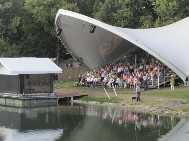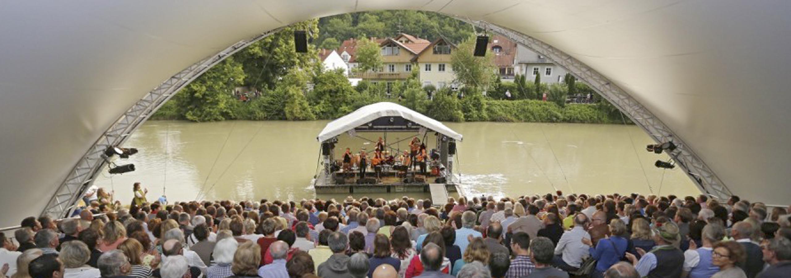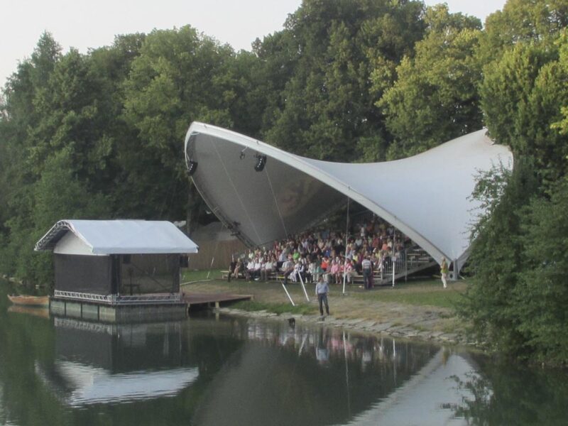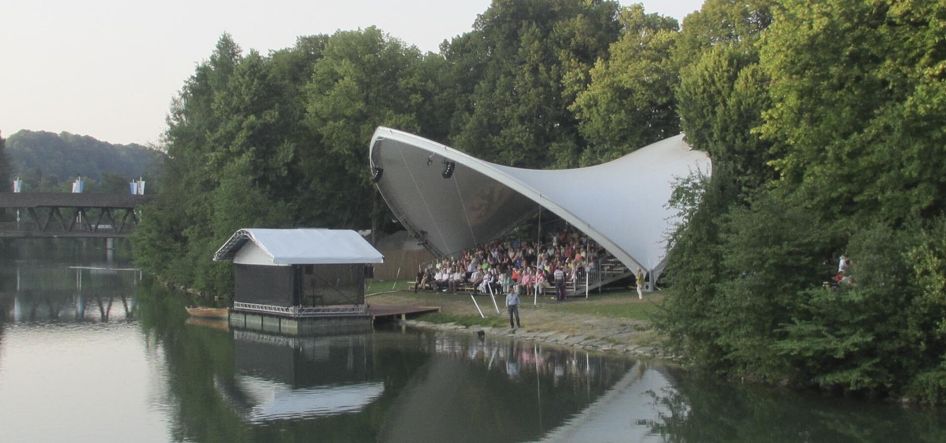 Am furnizat pentru acest eveniment cultural unul din sistemele noastre de acoperiș Opera-Tent. Sub acoperișul nostru s-a amenajat o tribună pentru aproximativ 350 de spectatori. Din tribuna bine protejată se deschidea o priveliște minunată asupra scenei plutitoare pe râul Loisach.