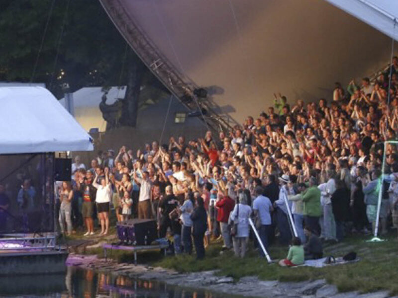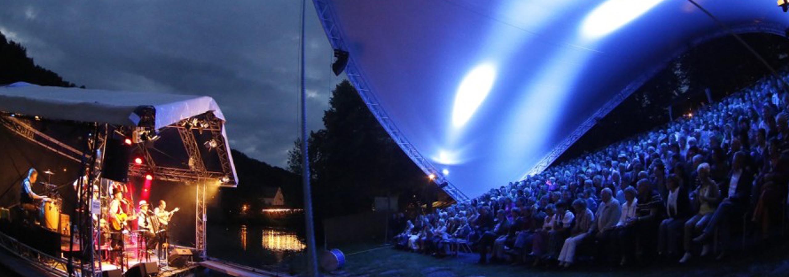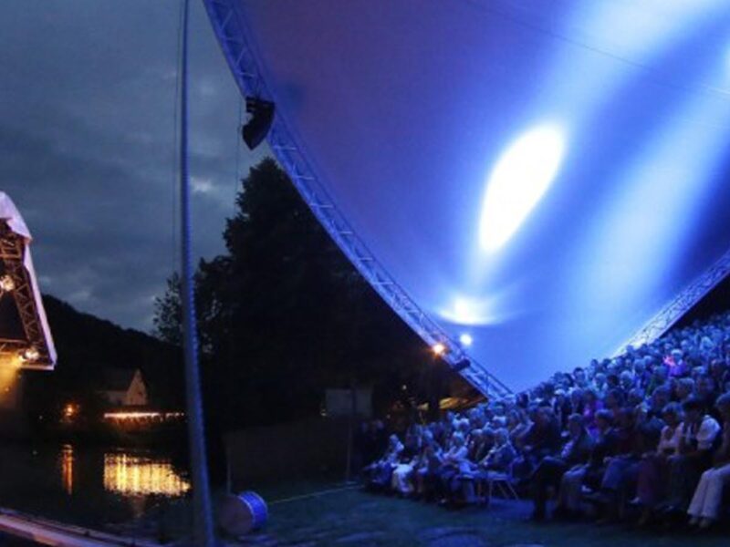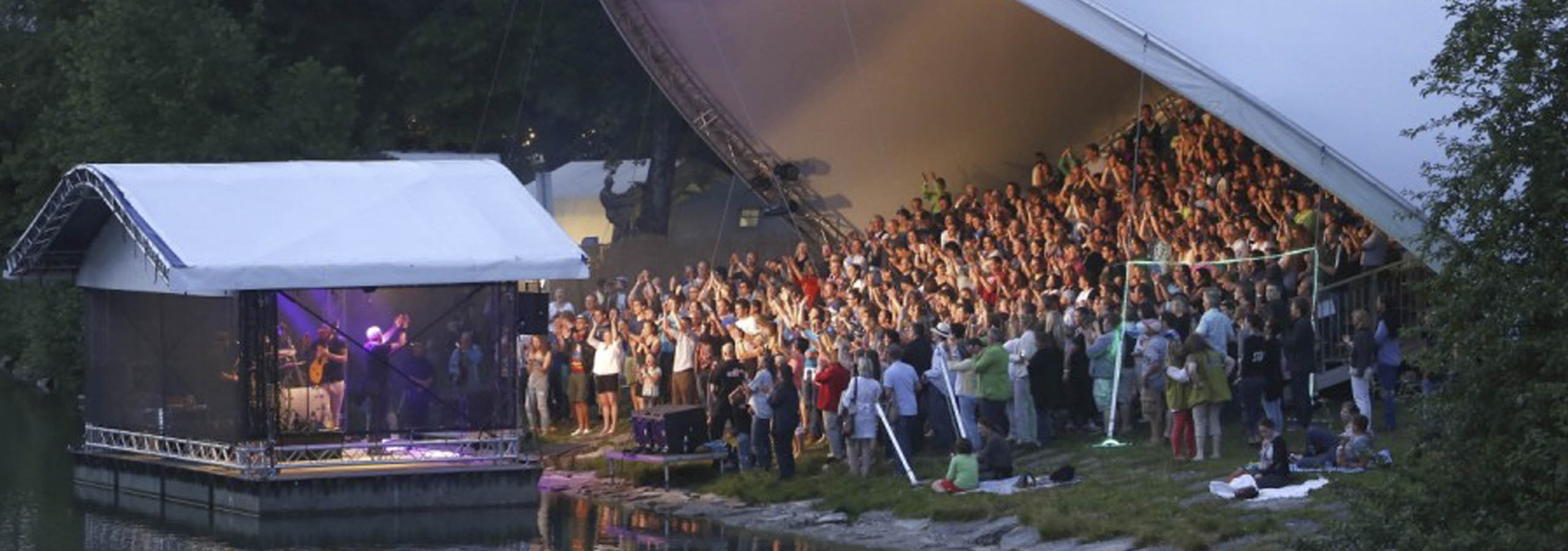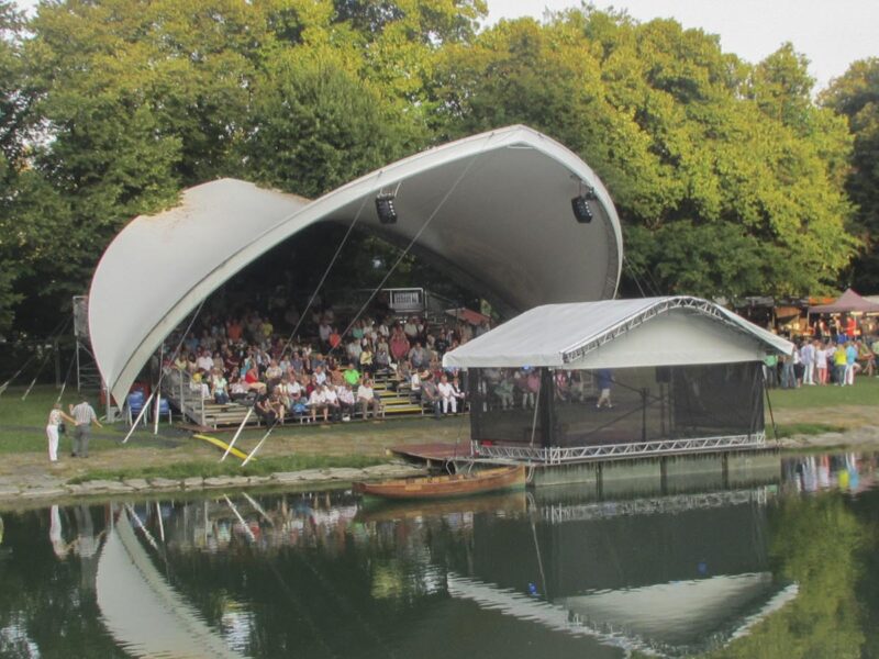 Am furnizat pentru acest eveniment cultural unul din sistemele noastre de acoperiș Opera-Tent. Sub acoperișul nostru s-a amenajat o tribună pentru aproximativ 350 de spectatori. Din tribuna bine protejată se deschidea o priveliște minunată asupra scenei plutitoare pe râul Loisach.