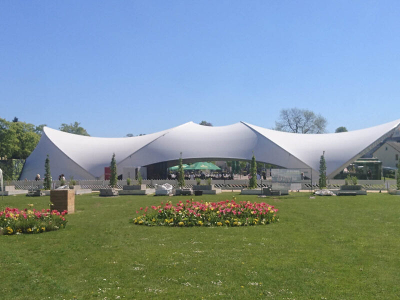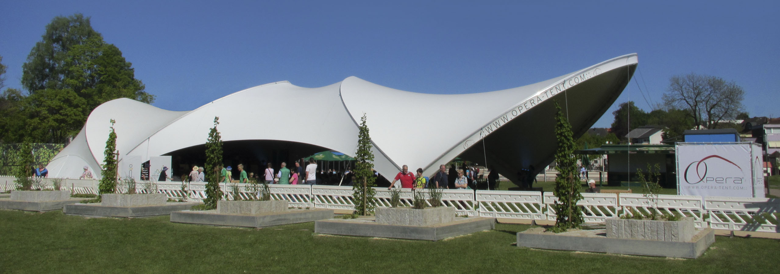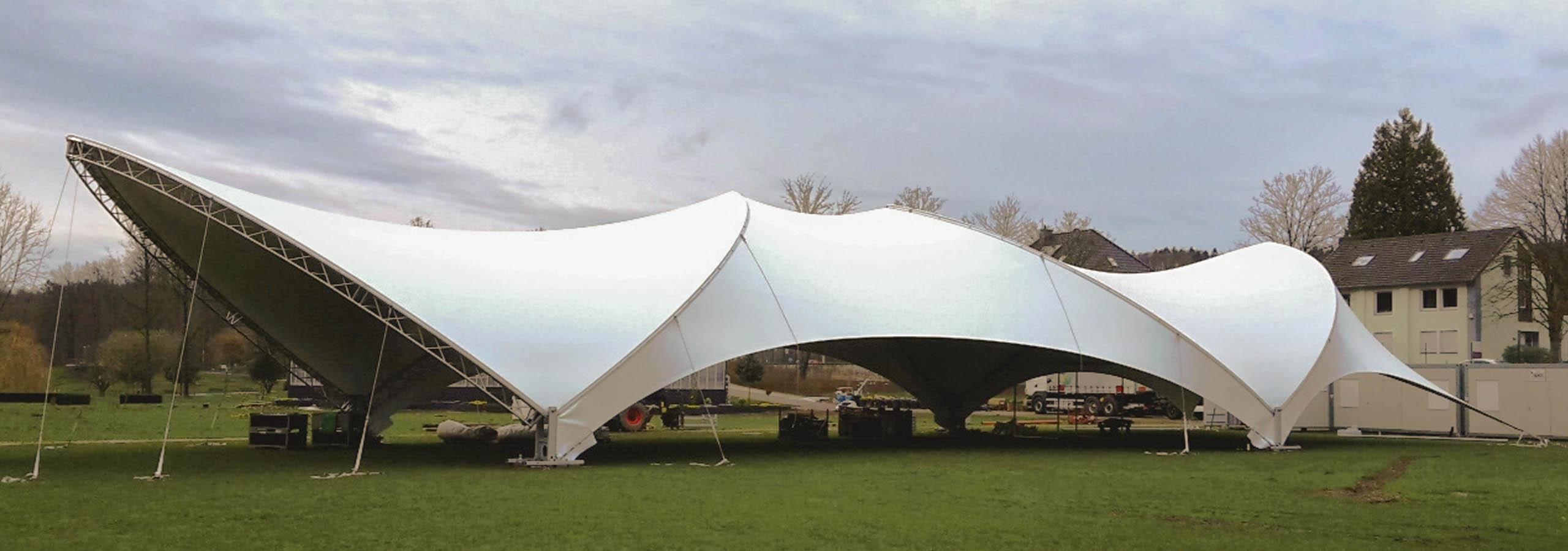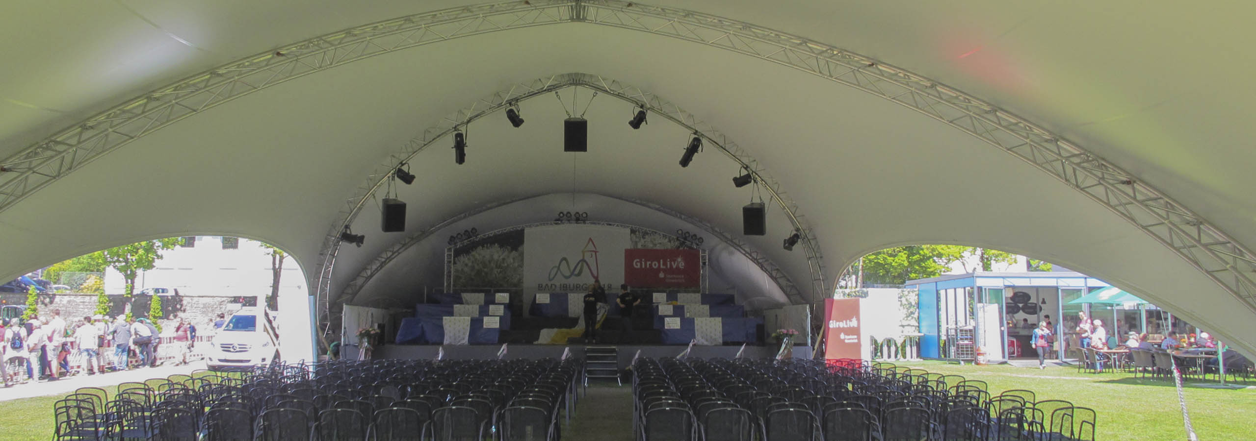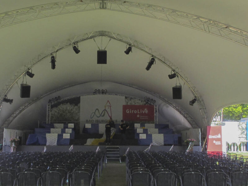 Am construit acolo o Opera 15×17 Duo închisă pe o parte. Aceasta a servit ca acoperire pentru scenă și spectatori pentru până la 400 de persoane. Pe scena GiroLive au avut loc aproape zilnic evenimente de cele mai diverse tipuri. În plus, am dezvoltat și livrat un sistem de scenă împreună cu un acces fără bariere printr-o rampă. Un rigg cu arc rotund s-a potrivit optim din punct de vedere optic cu forma cortului.
