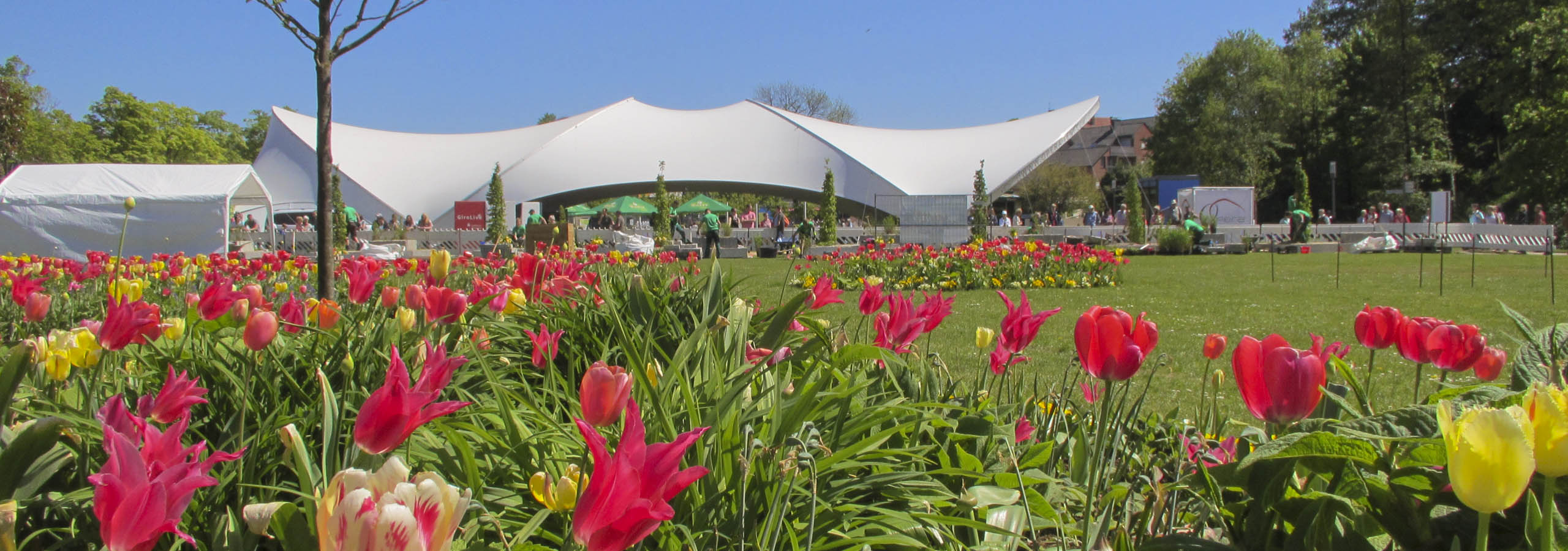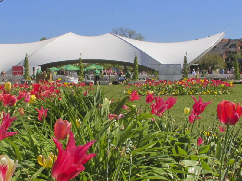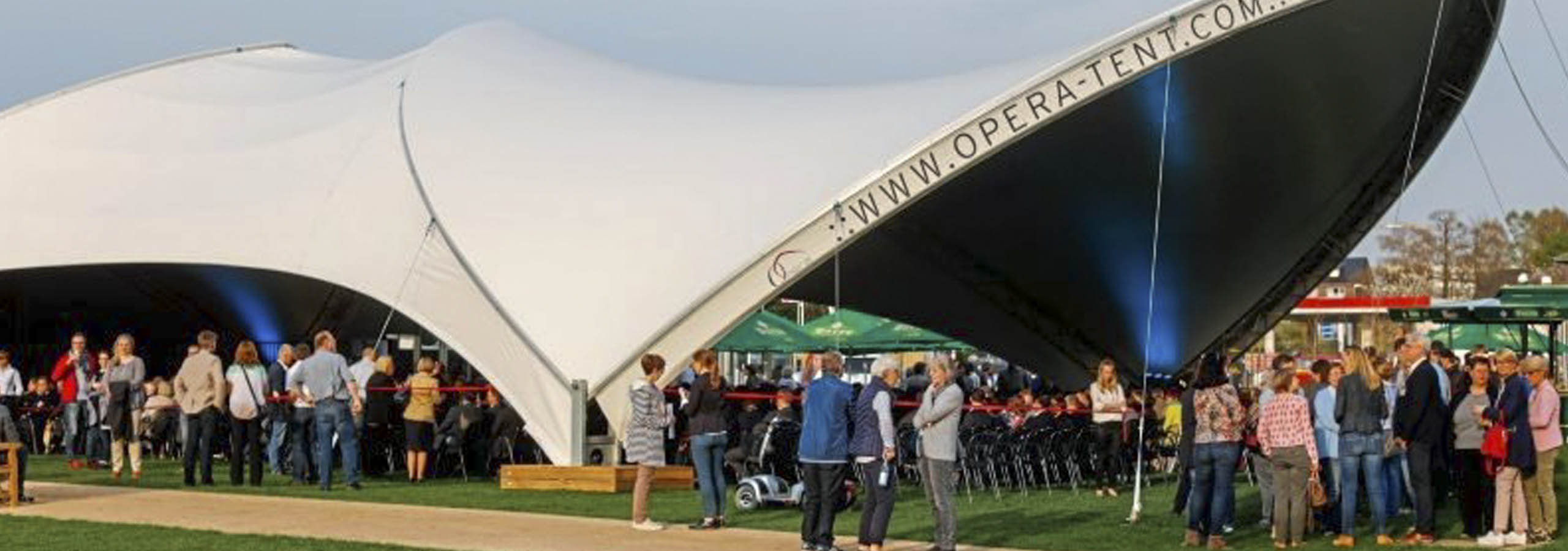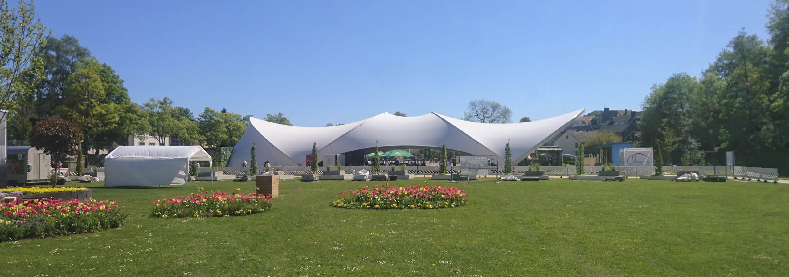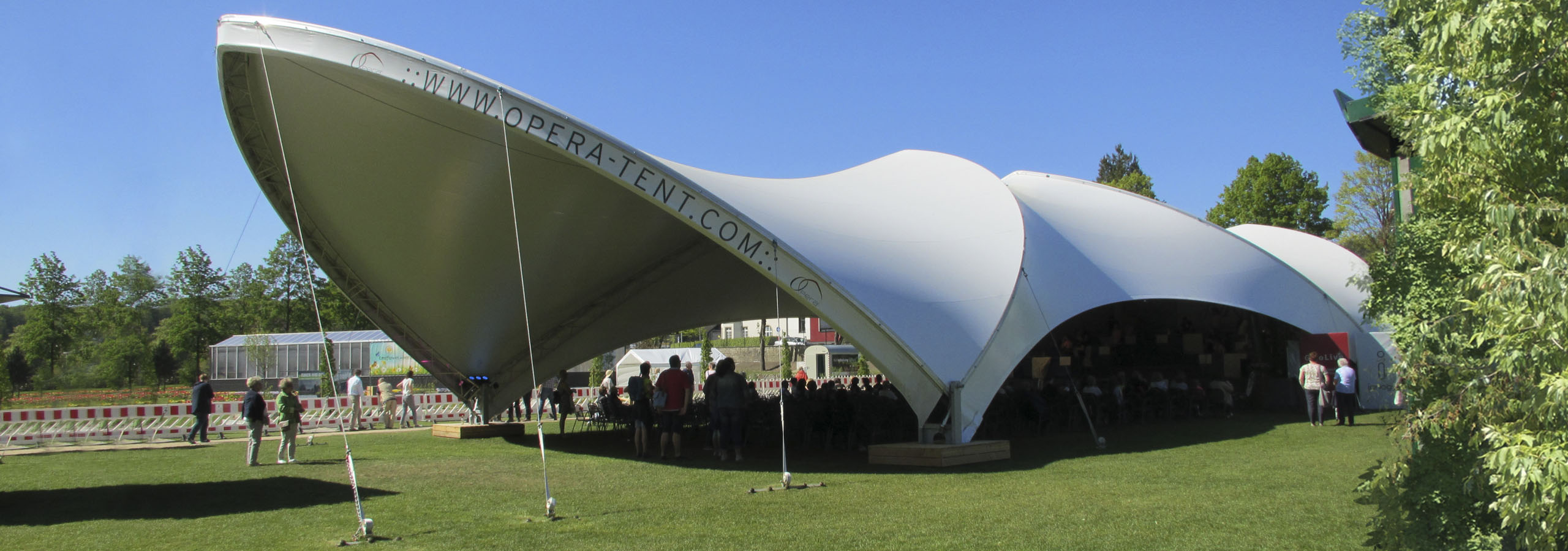 Am construit acolo o Opera 15×17 Duo închisă pe o parte. Aceasta a servit ca acoperire pentru scenă și spectatori pentru până la 400 de persoane. Pe scena GiroLive au avut loc aproape zilnic evenimente de cele mai diverse tipuri. În plus, am dezvoltat și livrat un sistem de scenă împreună cu un acces fără bariere printr-o rampă. Un rigg cu arc rotund s-a potrivit optim din punct de vedere optic cu forma cortului.