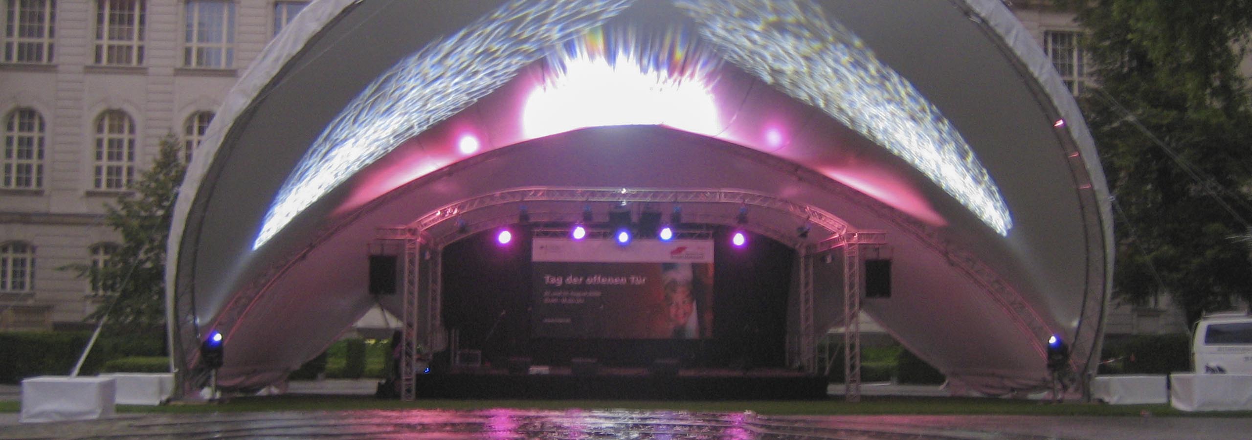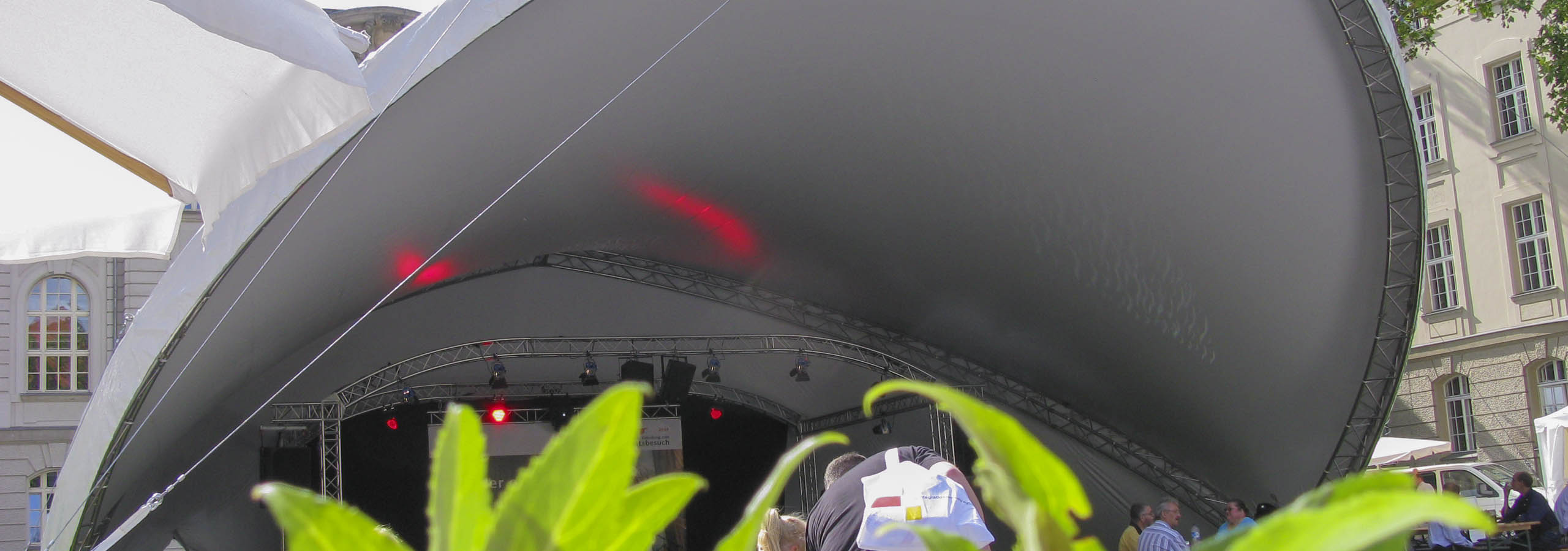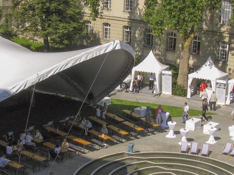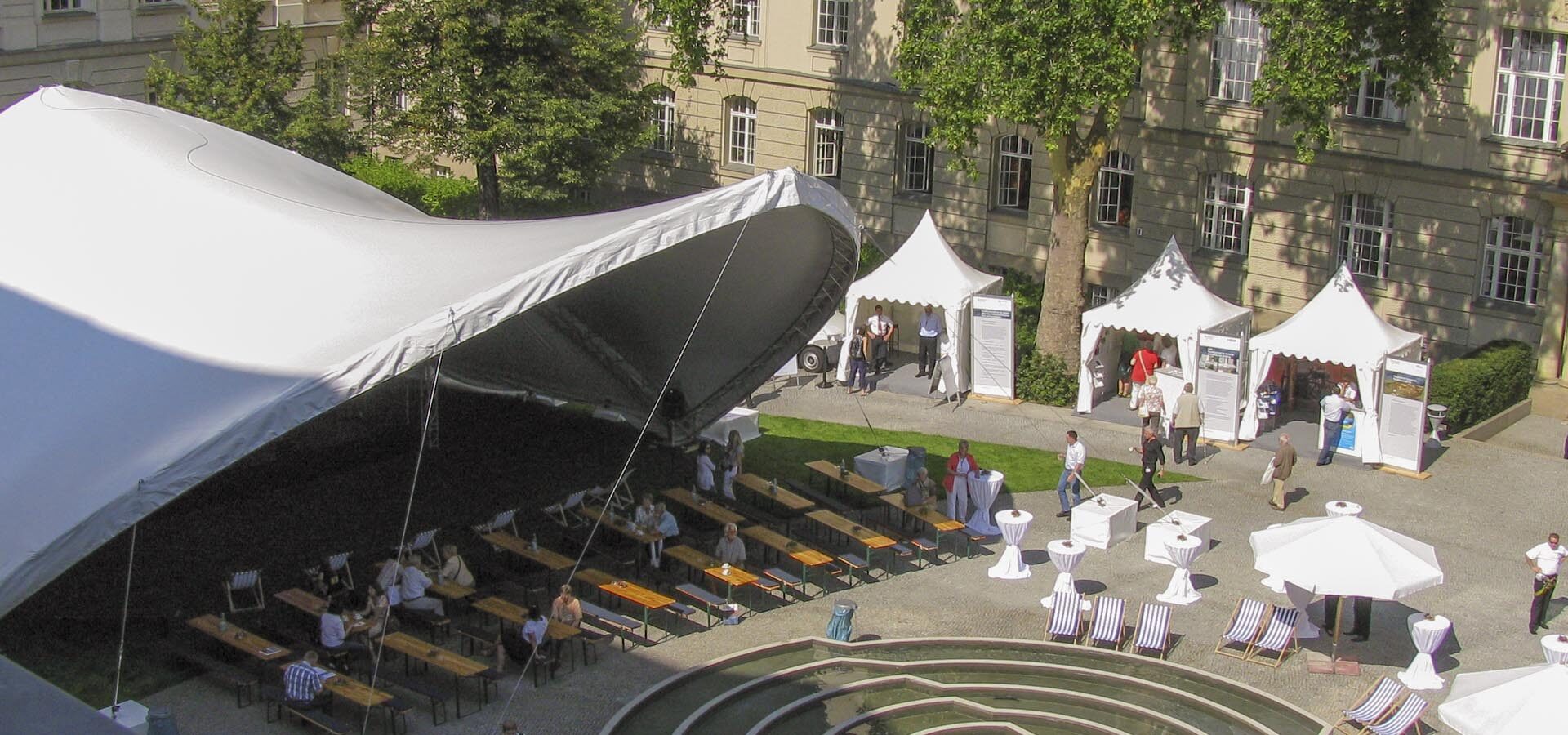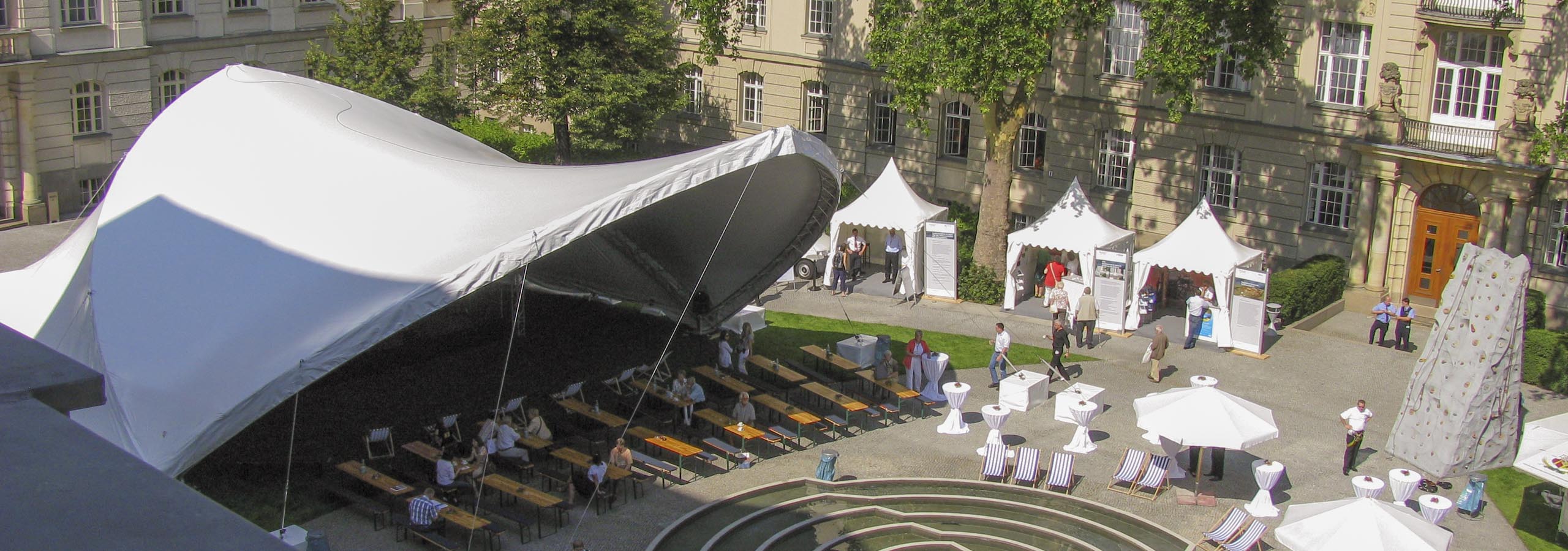 Pentru Ziua Porților Deschise a Ministerului Federal pentru Economie și Tehnologie am instalat sistemul nostru exclusiv de acoperire Opera-Tent.com în varianta Single deschisă pe o parte în curtea Goercke a BMWi.