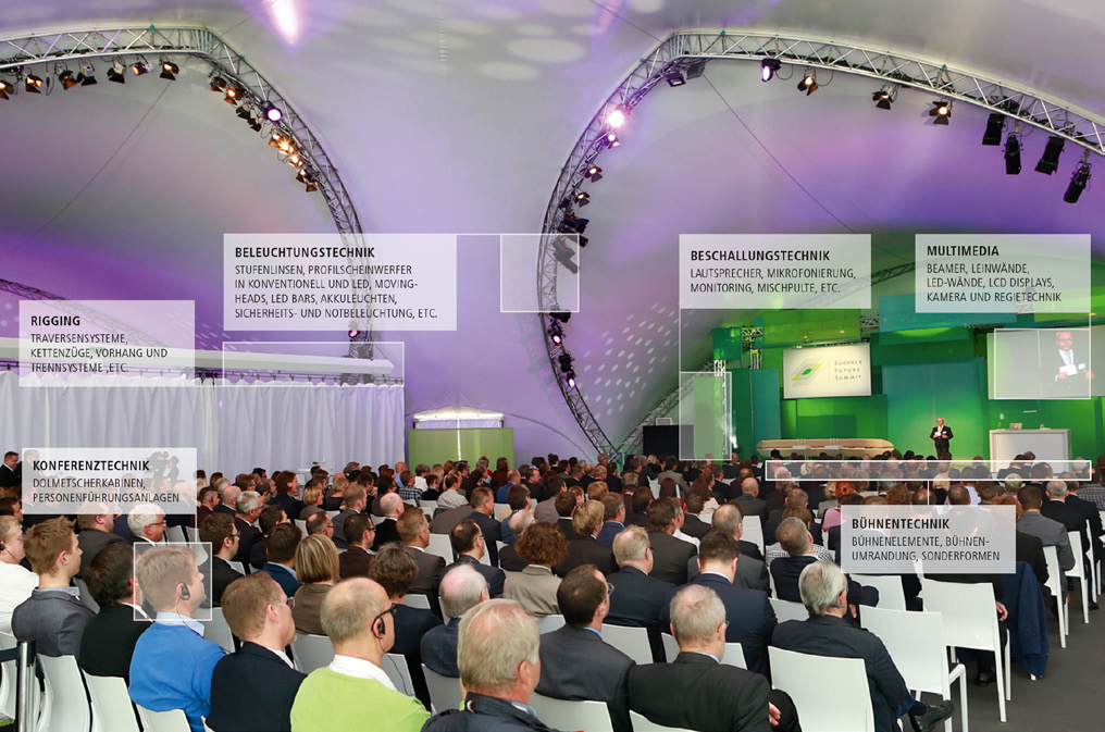 Neben exklusiven Eventzelten und Schirmen bieten wir auch erstklassige Eventtechnik, speziell abgestimmt auf das jeweilige Event. „State of the art“-Technik aus den Bereichen Ton, Licht, Multimedia, Konferenz, Rigging und Bühne.